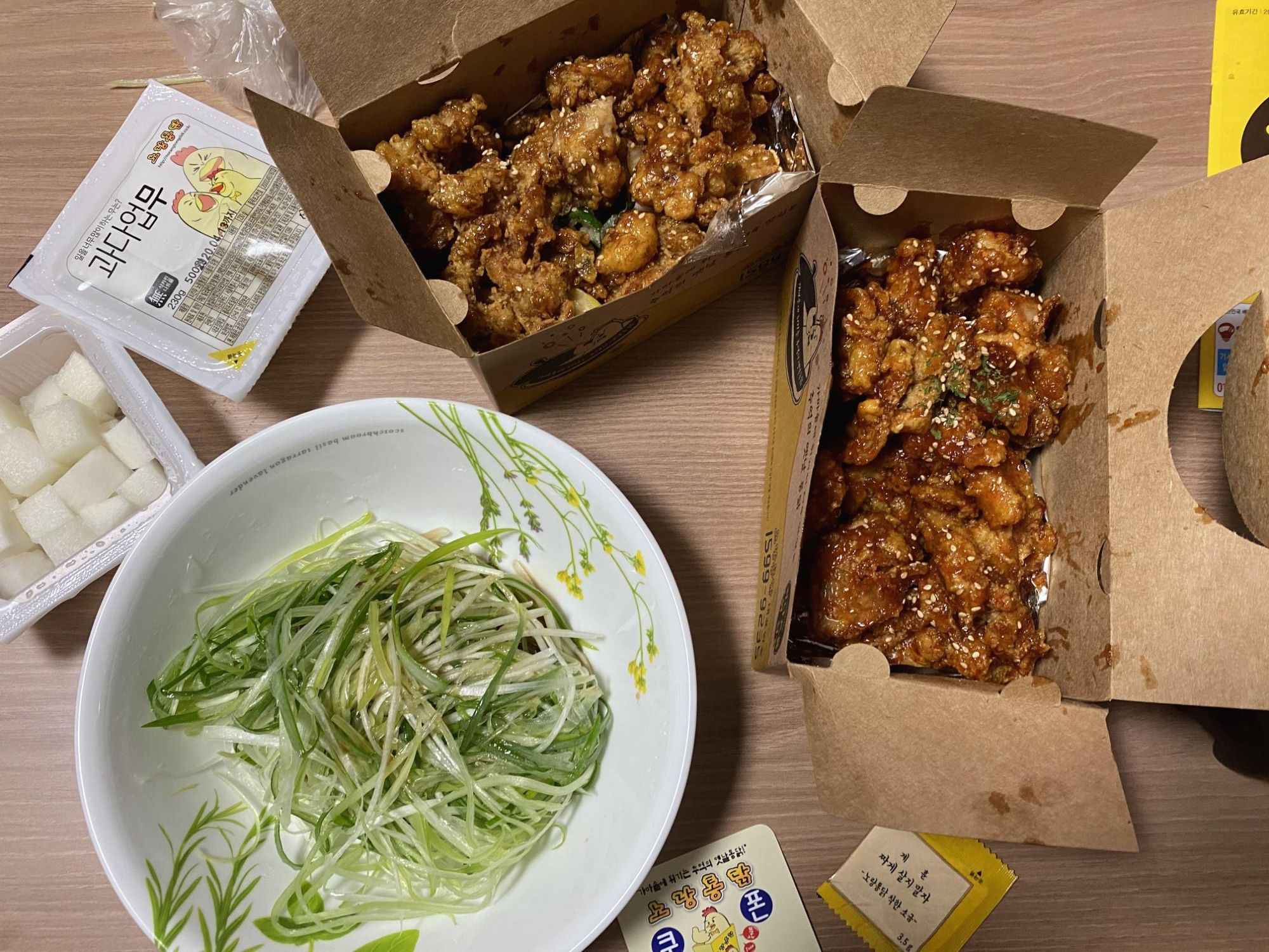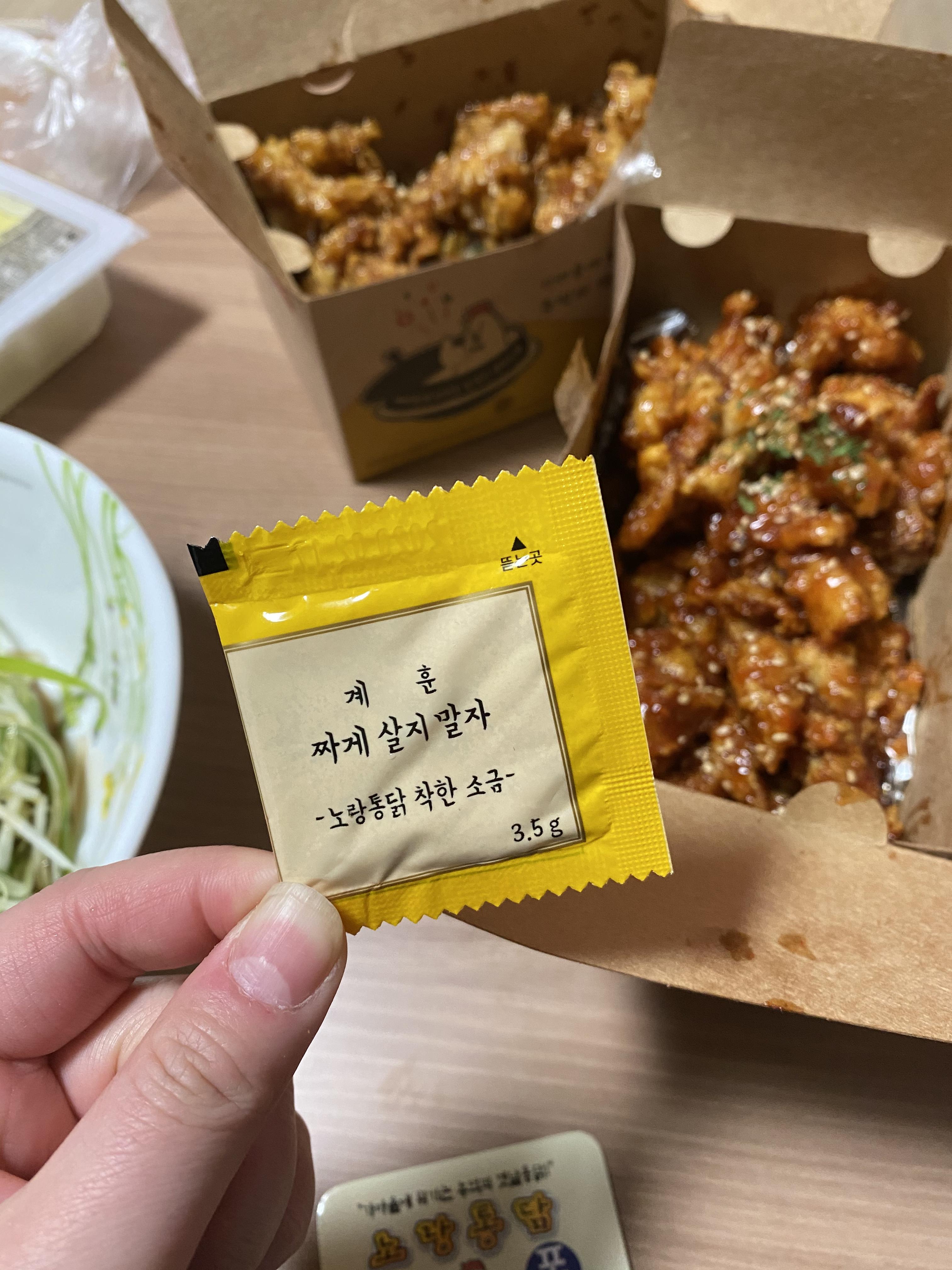 노랑 통닭은 치킨무의 포장마저 뭐가 노랑 통닭과 잘 어울리는 이미지네요 ㅋㅋ