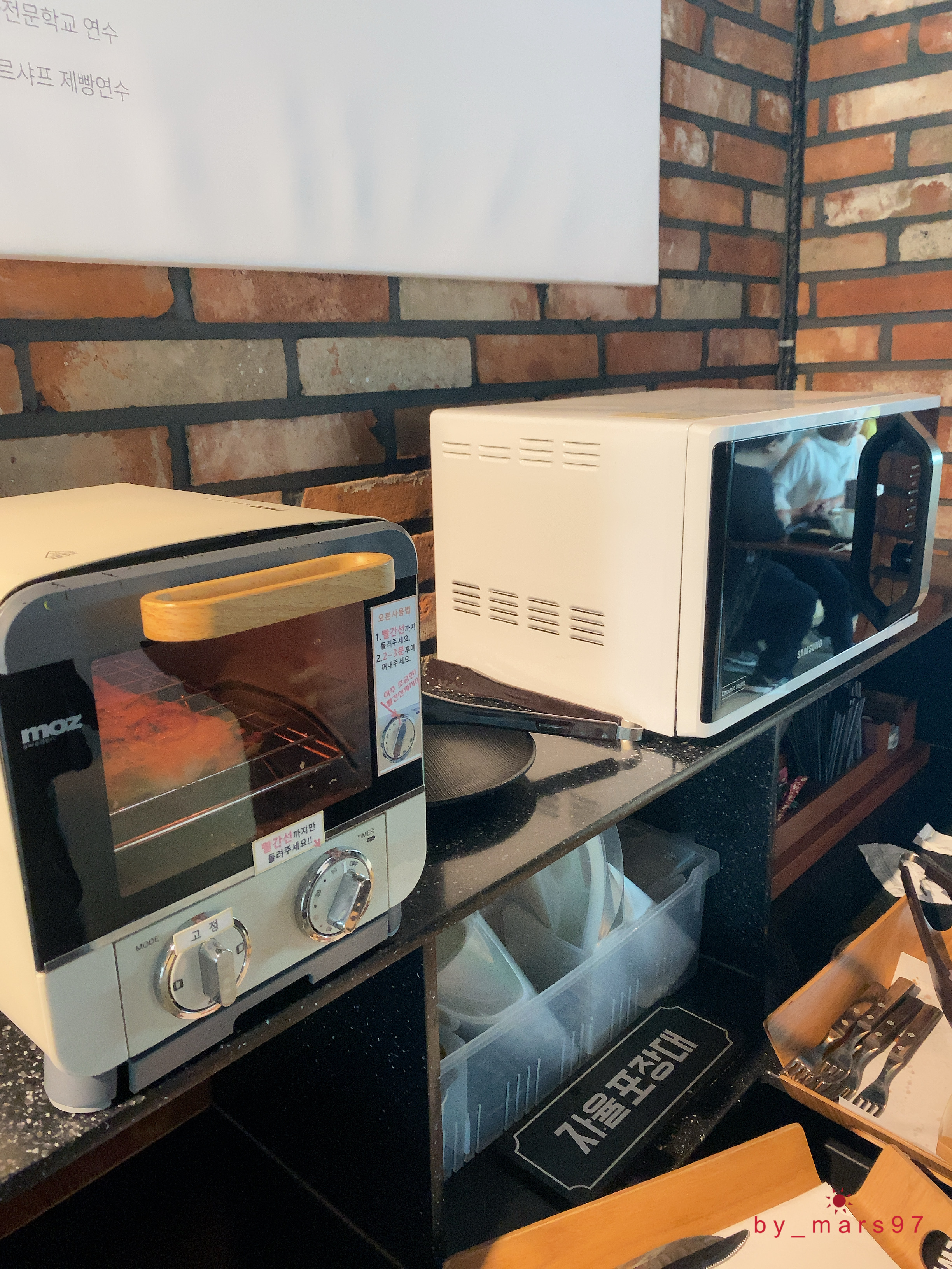 뒷편으로는 정수기가 있고 빵을 데울 수 있는 미니 오븐과 전자레인지가 있어요