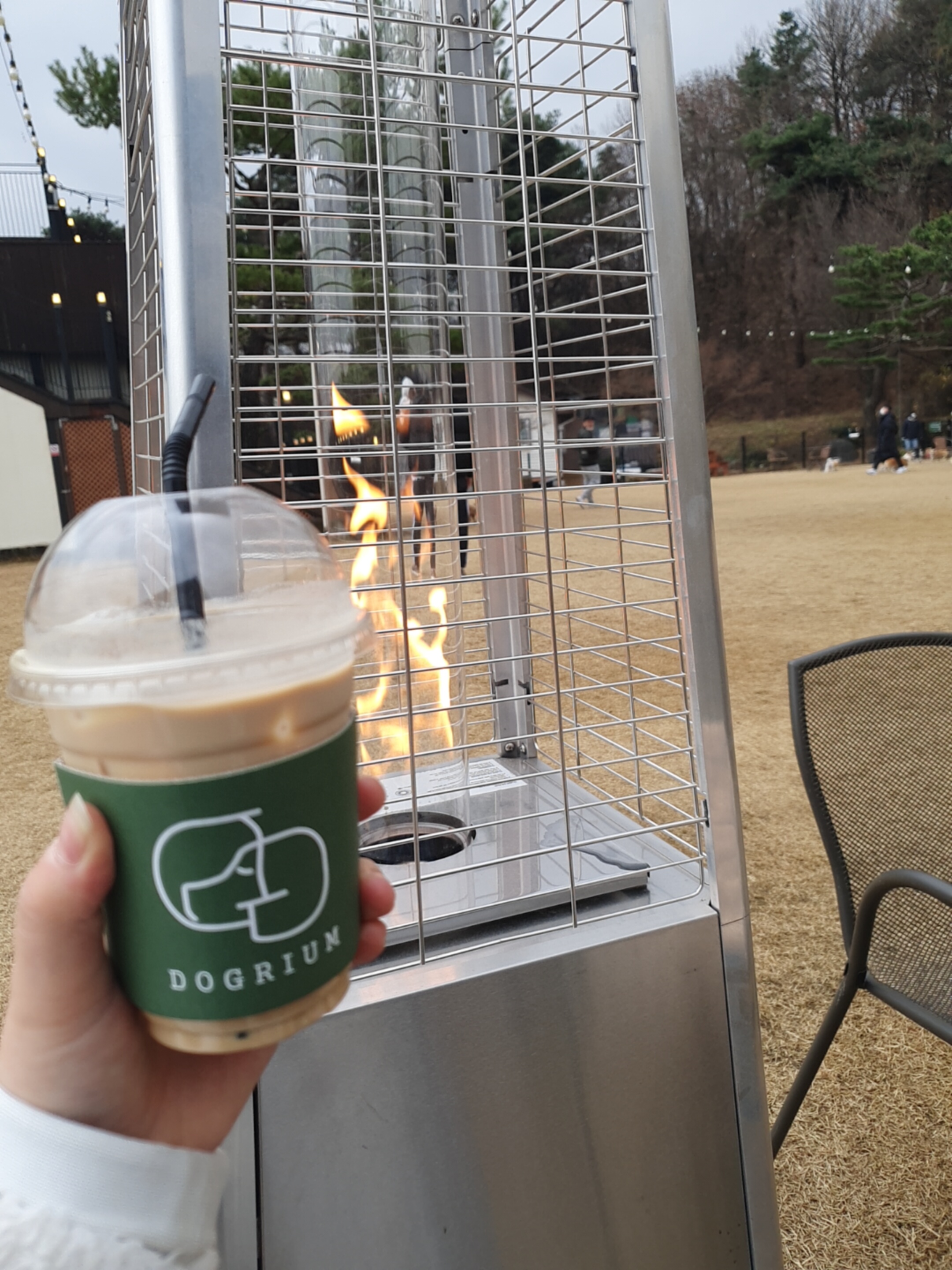 난로 앞에서 아이스 바닐라 라떼 한잔