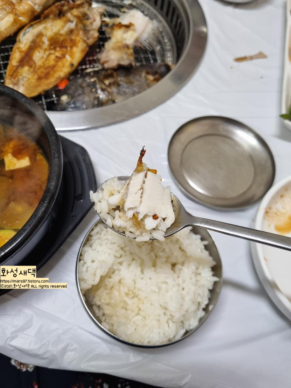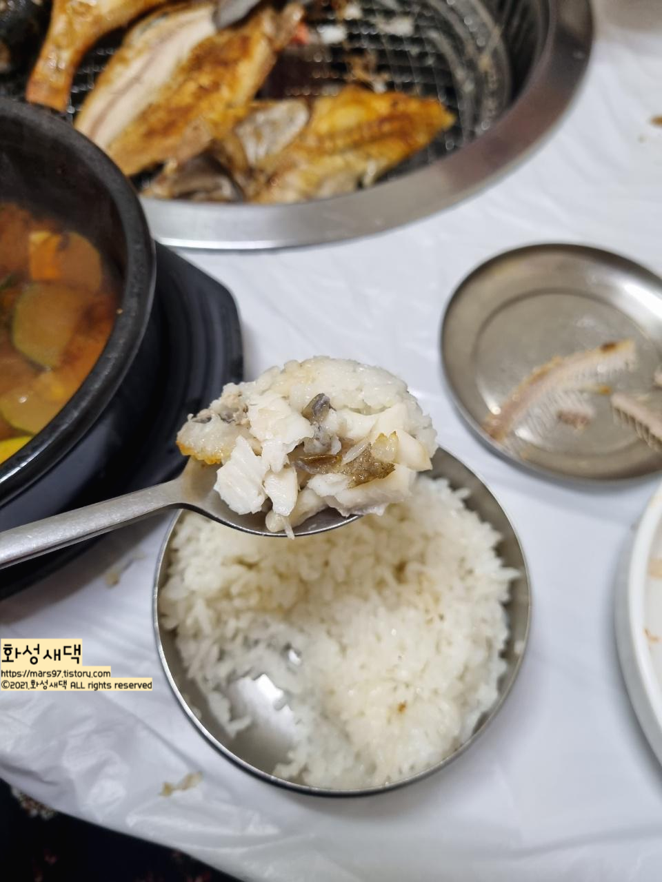 쌀밥에 잘 구워진 생선을 올려 먹으니