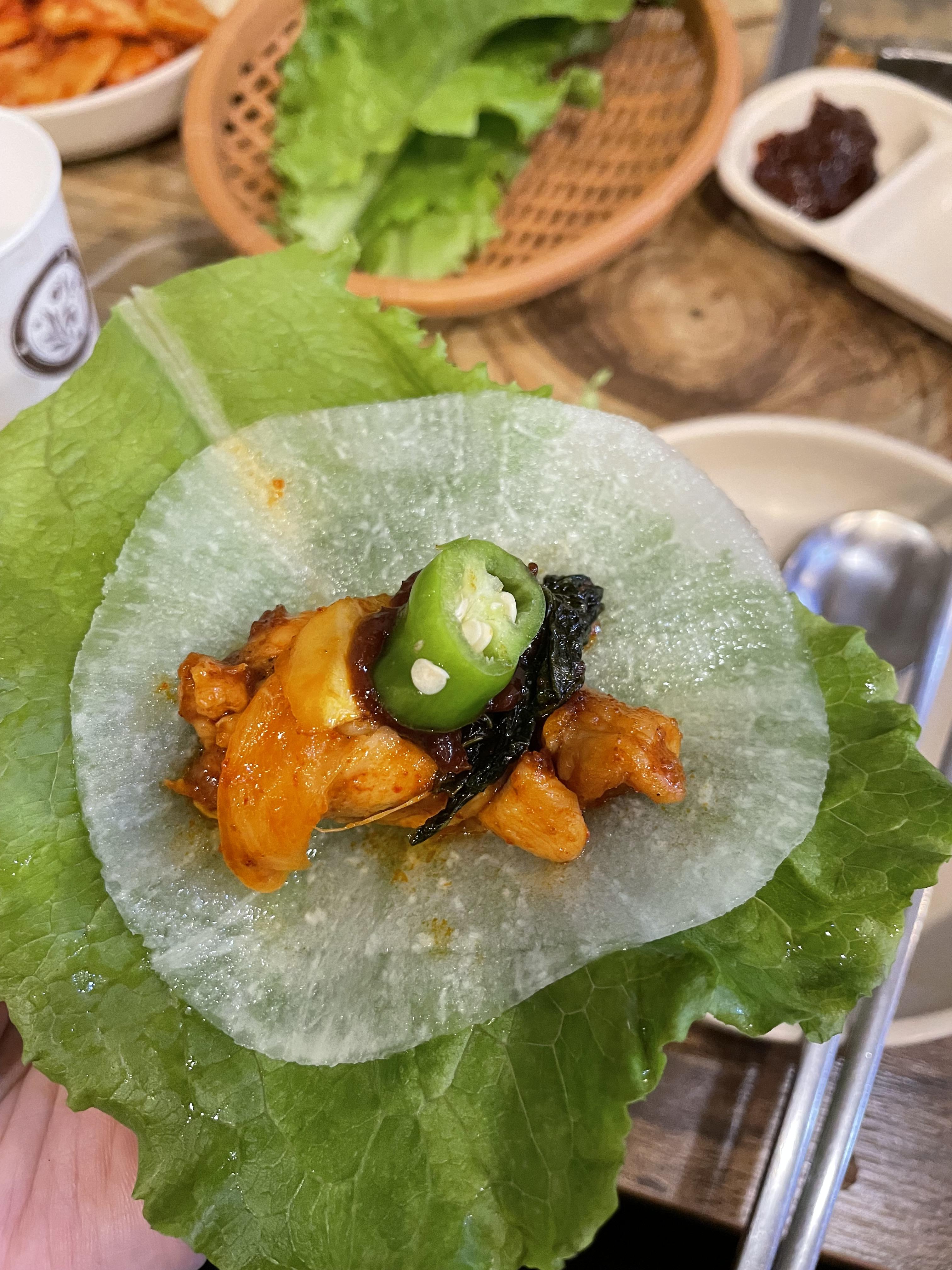 상추에 무쌈 올리고 닭갈비 그리고 고추까지 올려 먹으니