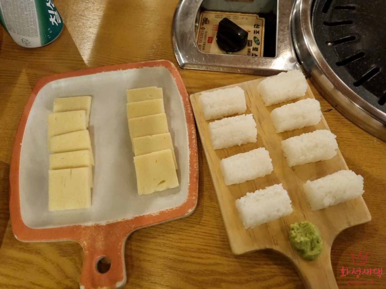 차돌박이와 돌 초밥 차 쫄면, 구워 먹는 치즈가 같이 나오는 세트 메뉴로 주문했어요