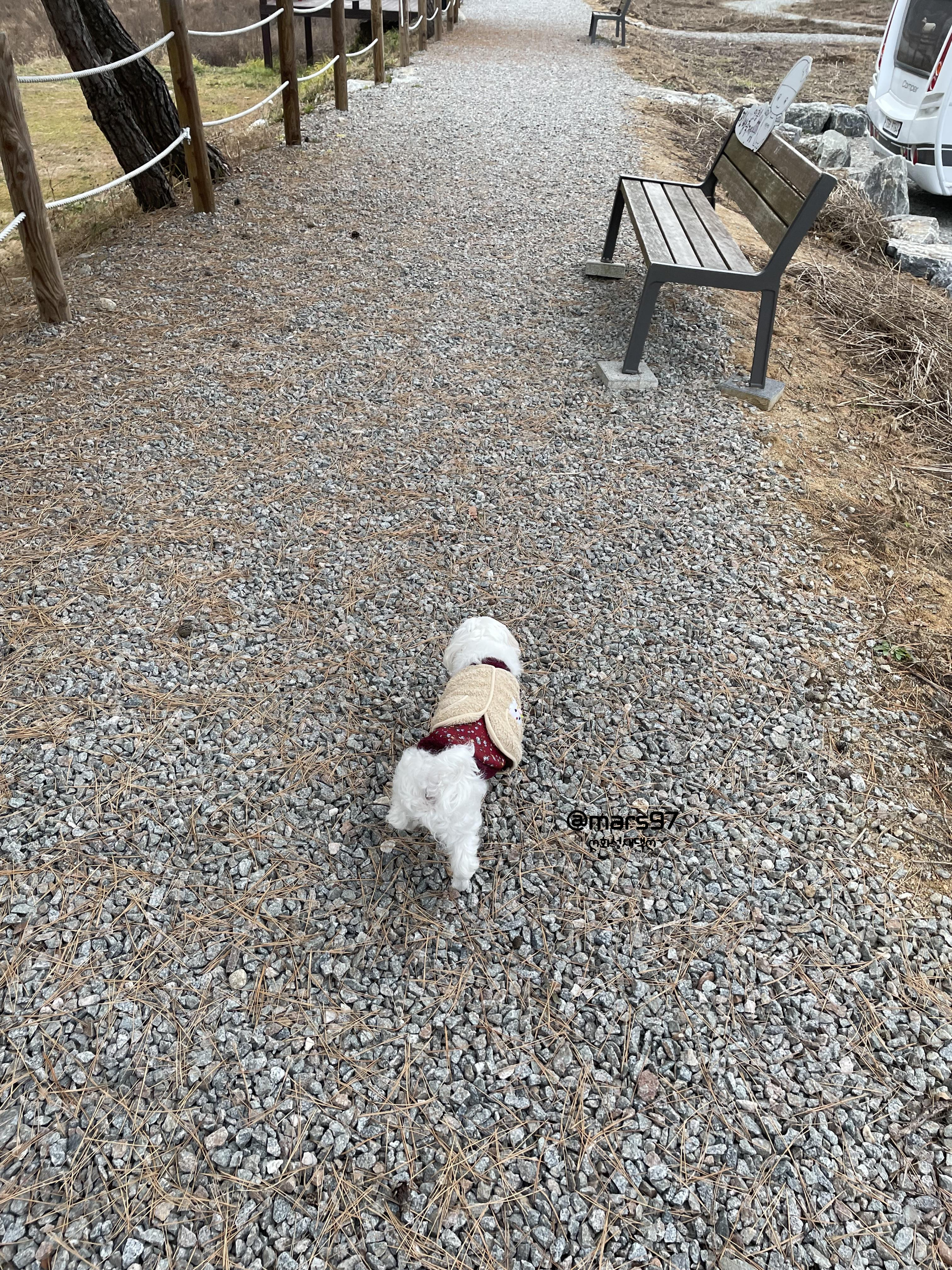 다행히 저희 말고는 아무도 없어서 목줄을 안 하고 다녔어요