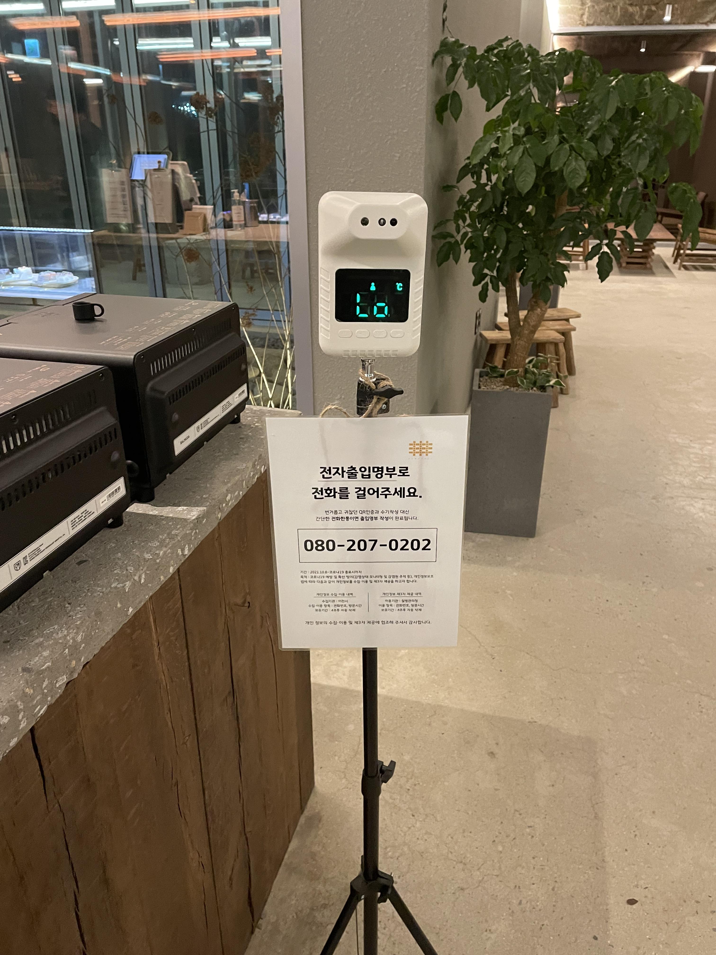 들어가자마자 체온 체크와 전자출입 명부로 전화를 걸어 줍니다