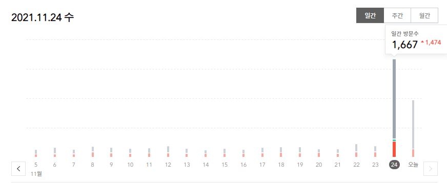 오늘 확인한 다음 메인에 노출되었을 때 총 방문자 수는 1,667명 이었어요