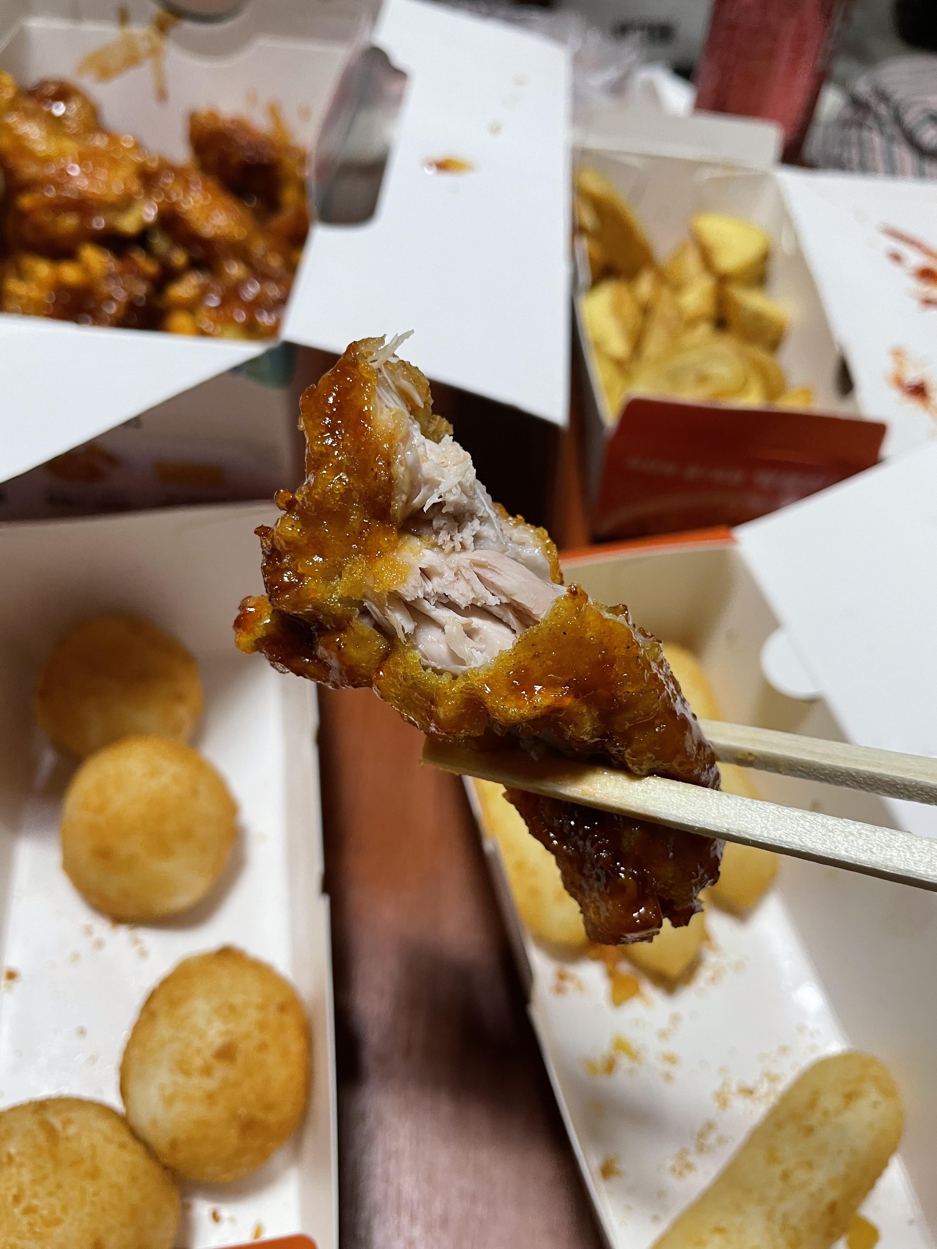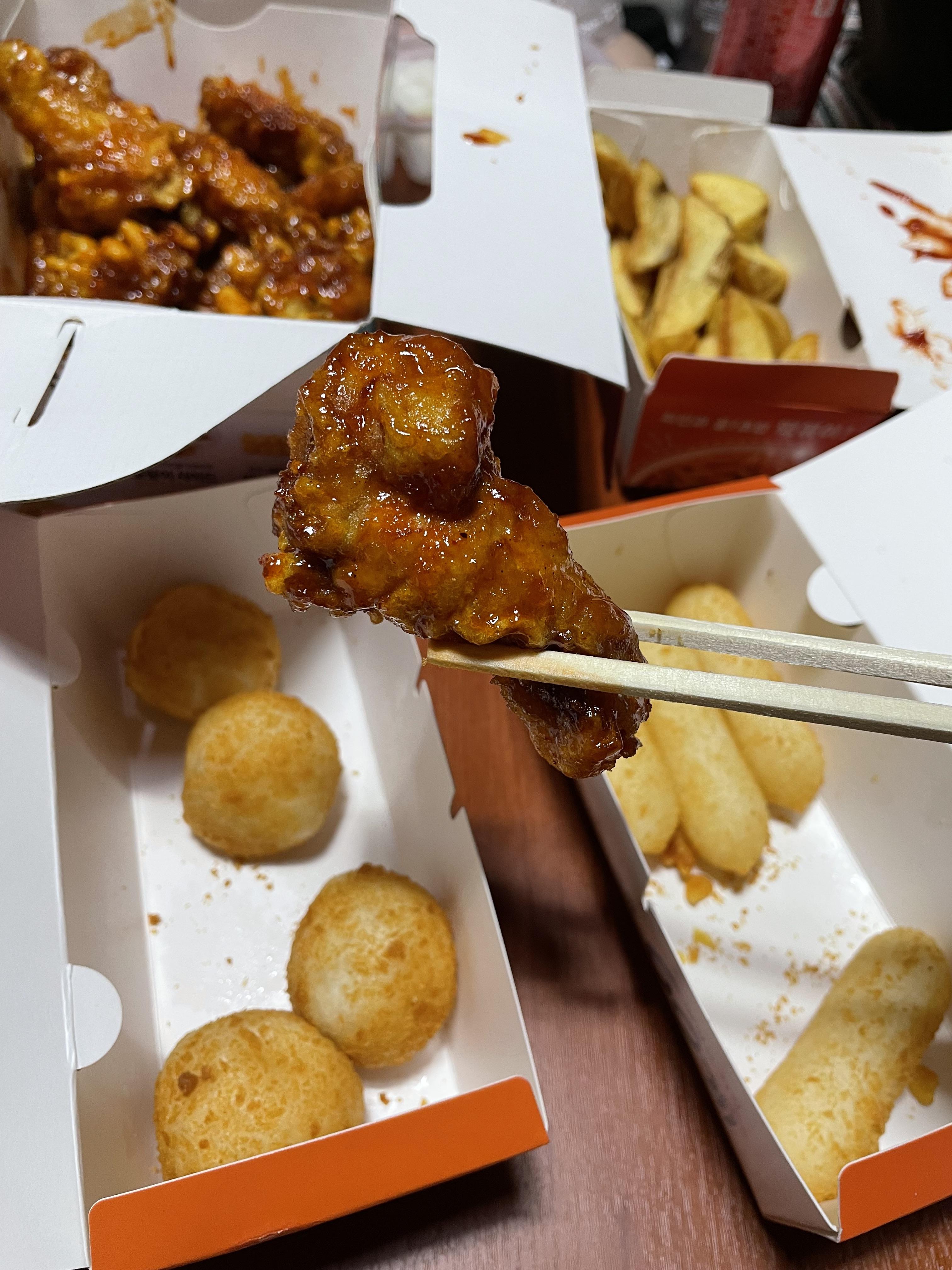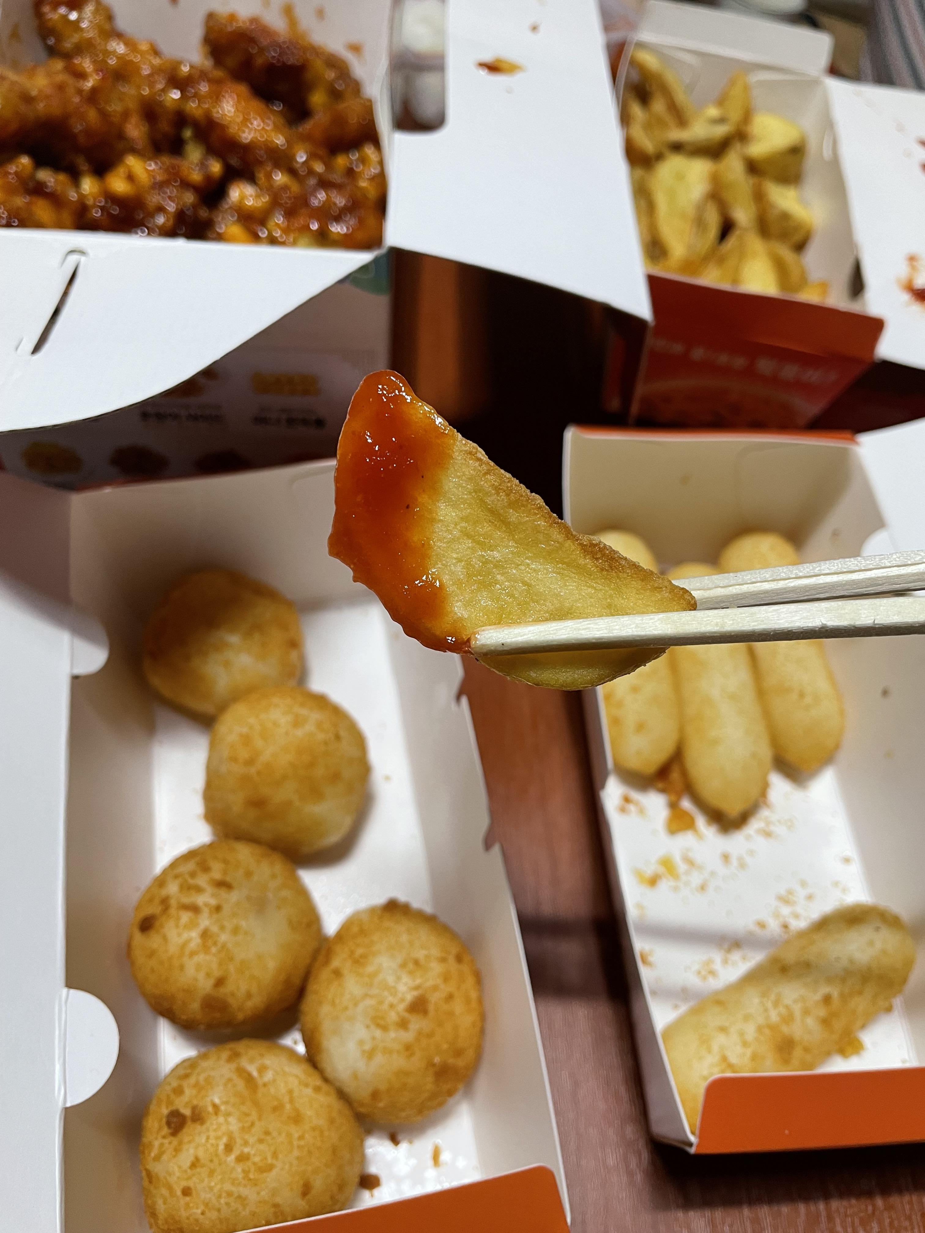 장스 치킨 양념이 묻어 있어서 케챂에 찍어 먹는 것보다 훨씬 맛있어요