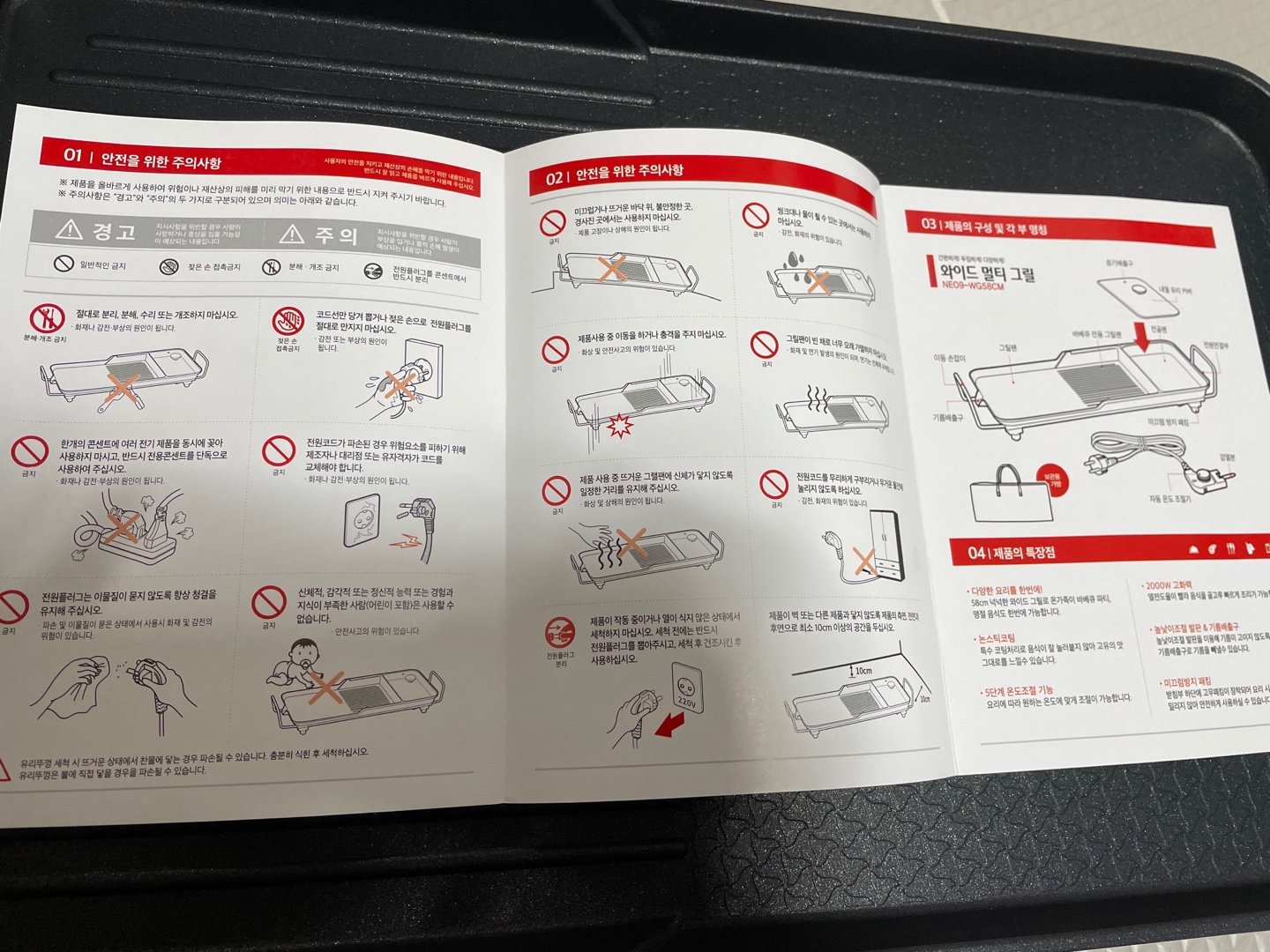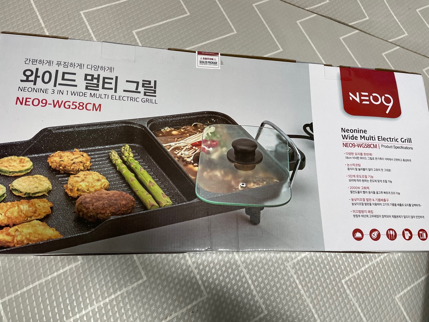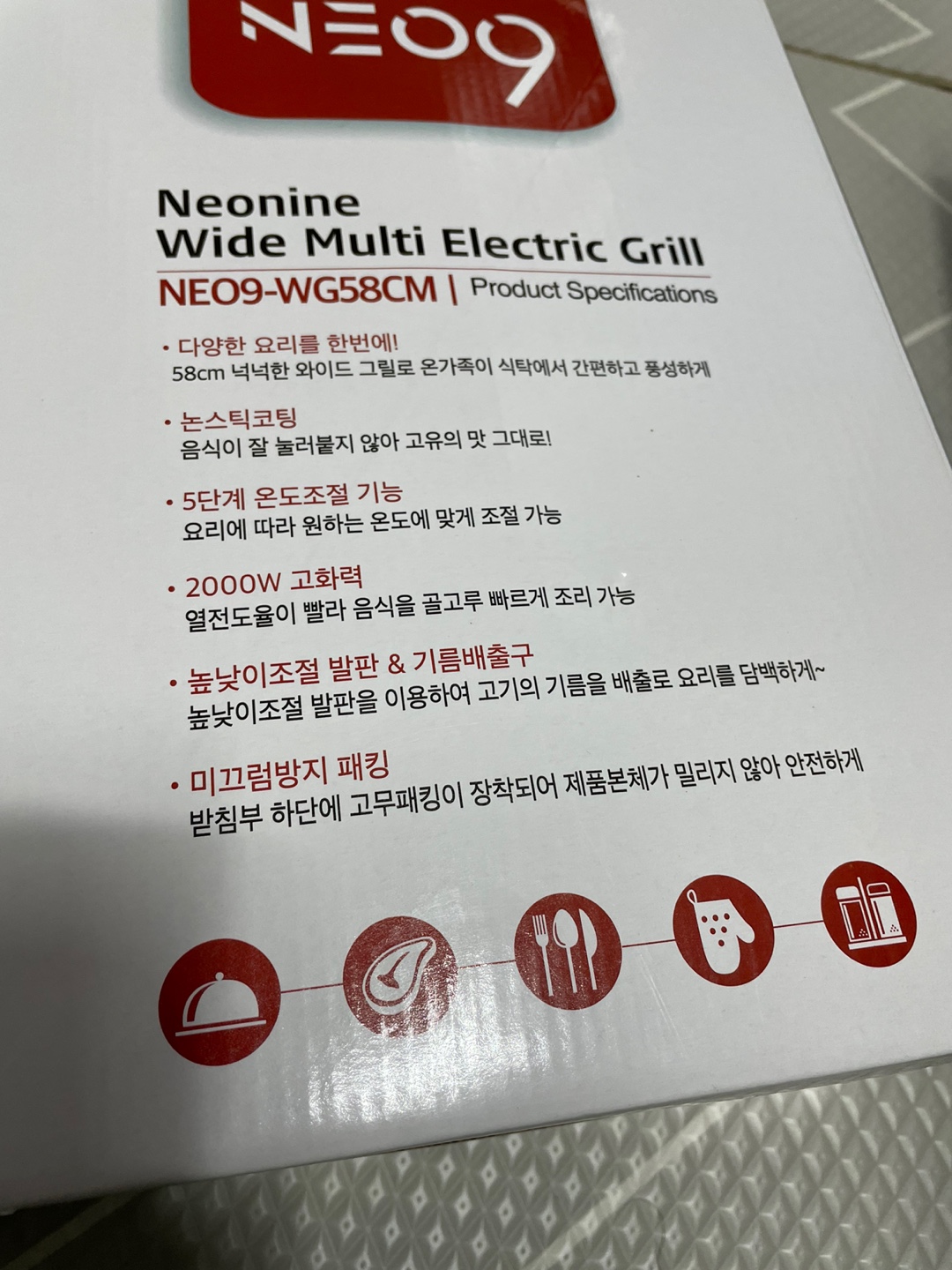박스 겉면에 네오 나인 와이드 멀티 그릴의 설명이 적혀 있어요