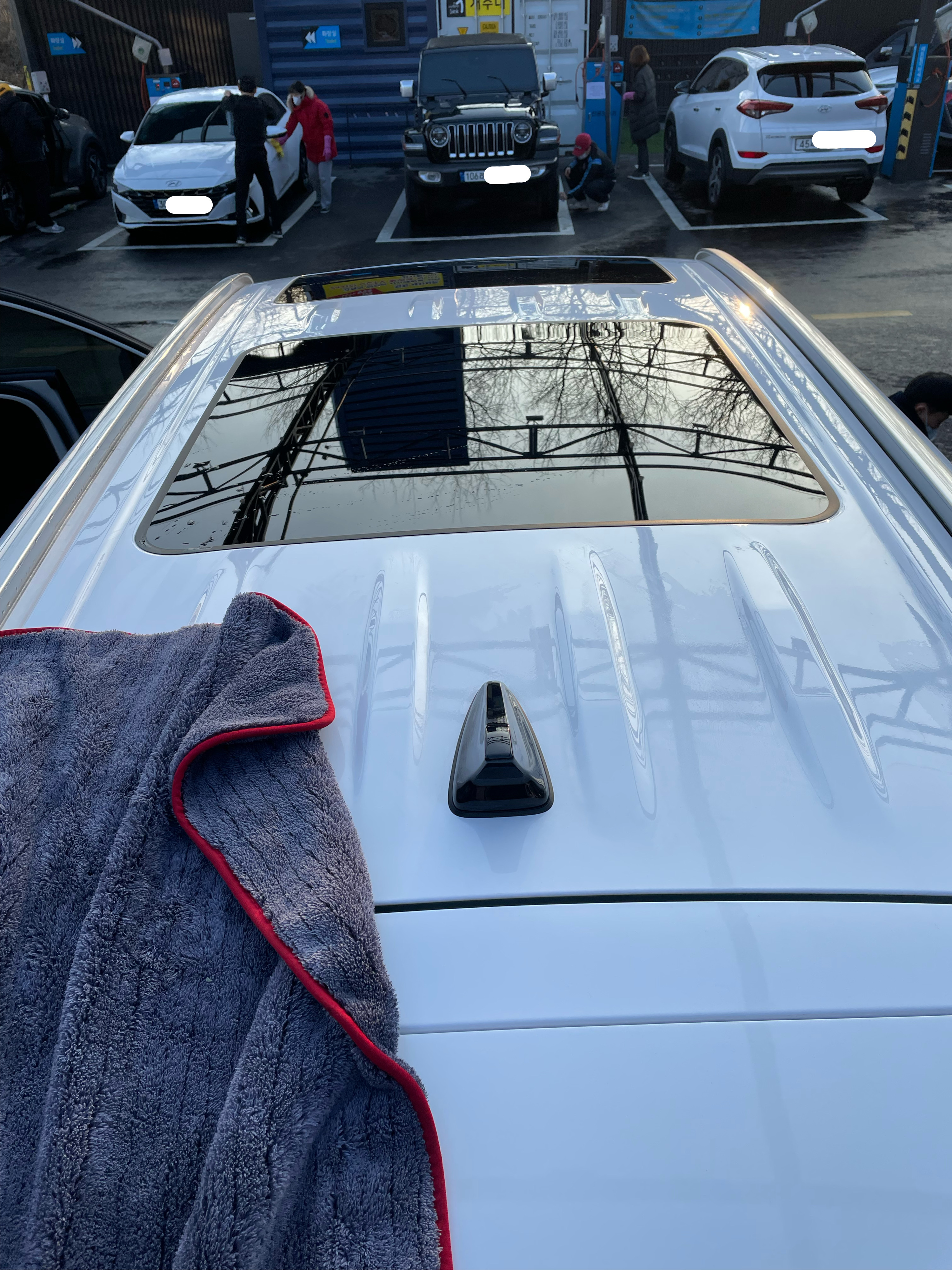 계단을 밟고 올라가 차 지붕과 선루프도 꼼꼼히 물기 제거해 주었어요