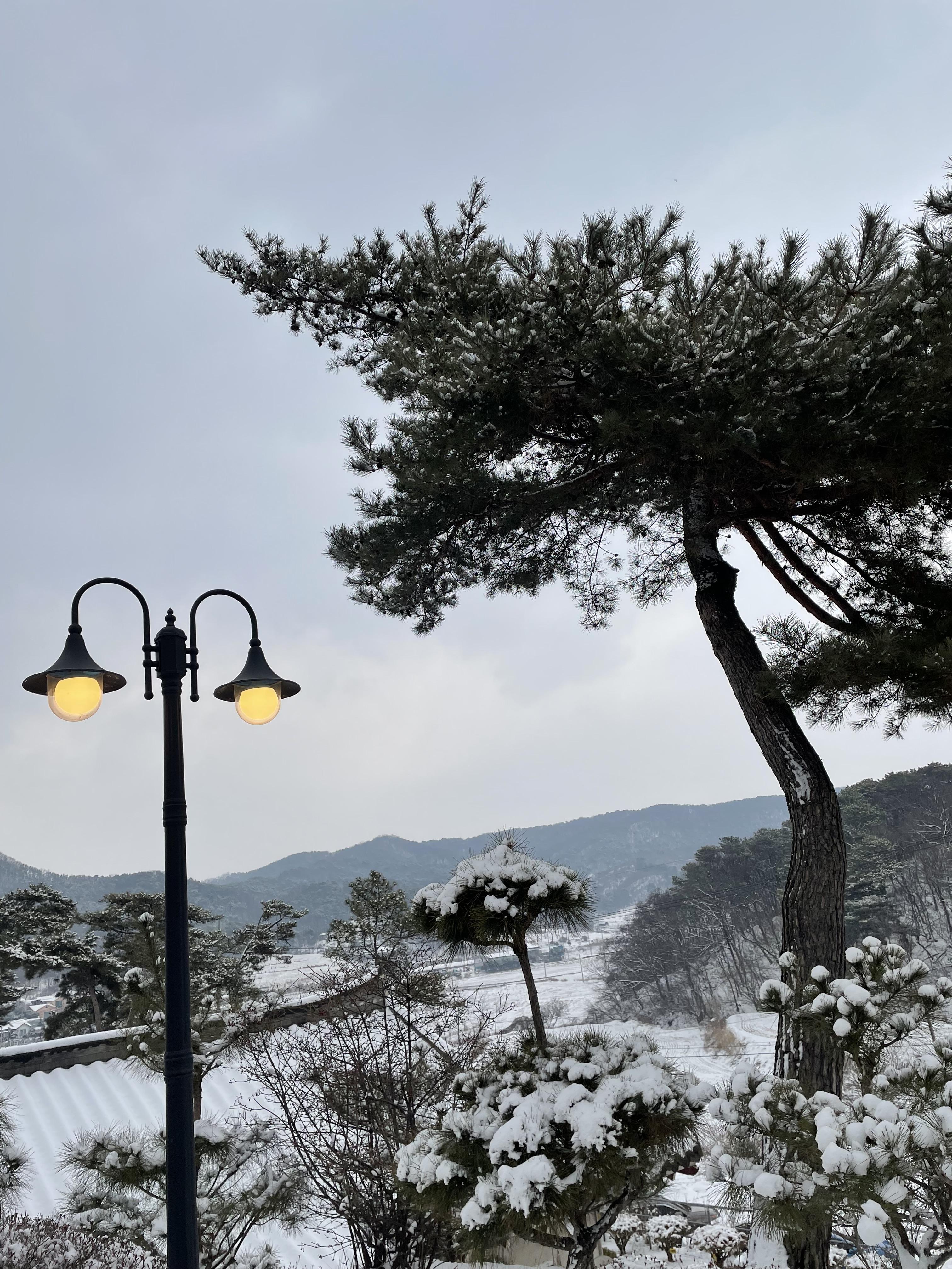 나뭇가지 위에 눈이 소복이 쌓여 예쁘더라고요