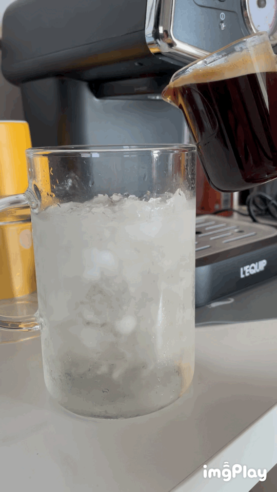미리 준비해둔 컵에 얼음과 물을 넣고 내린 커피를 부어 줍니다