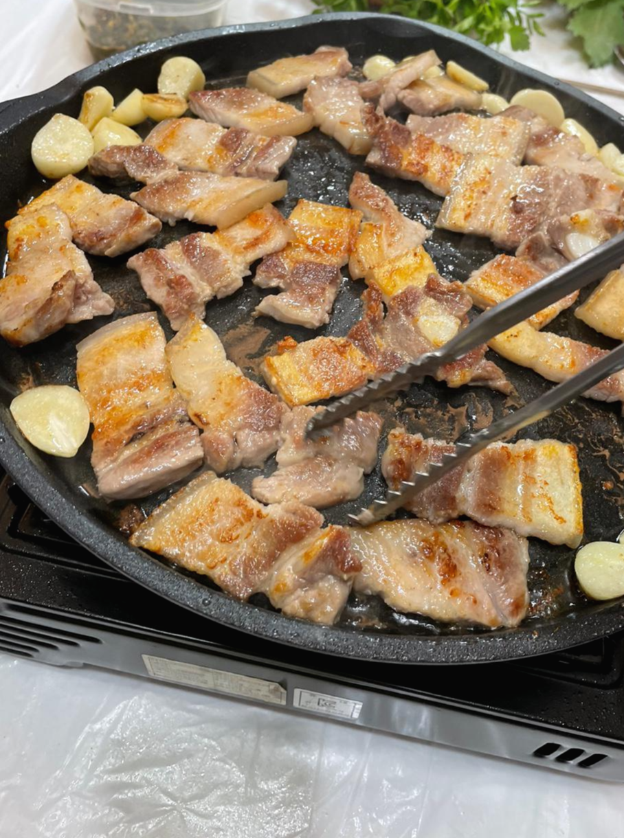 이모님은 염소탕 끓이시고 한쪽에서는 삼겹살을 구웠어요
