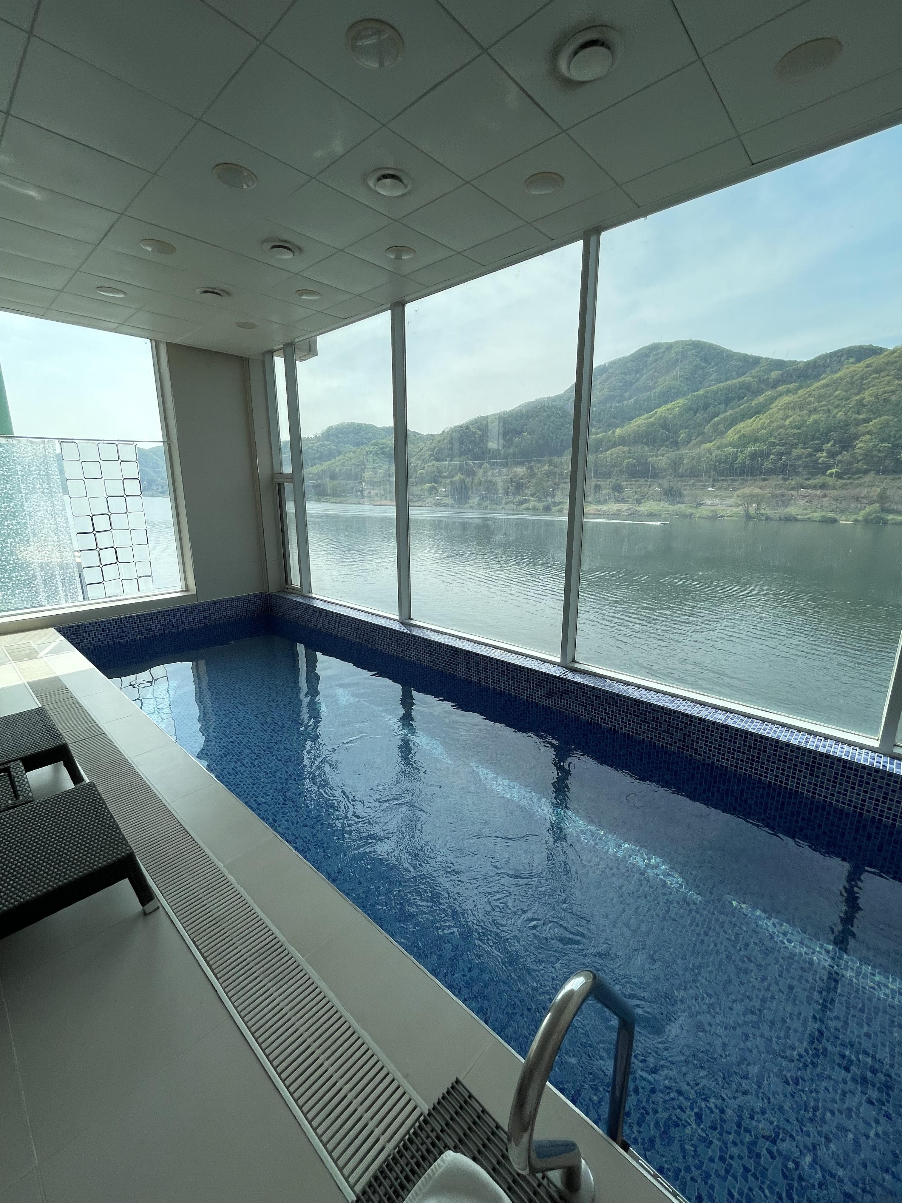 문을 열고 들어가자마자 보이는 엄청 큰 수영장과 북한강 뷰 보이시나요