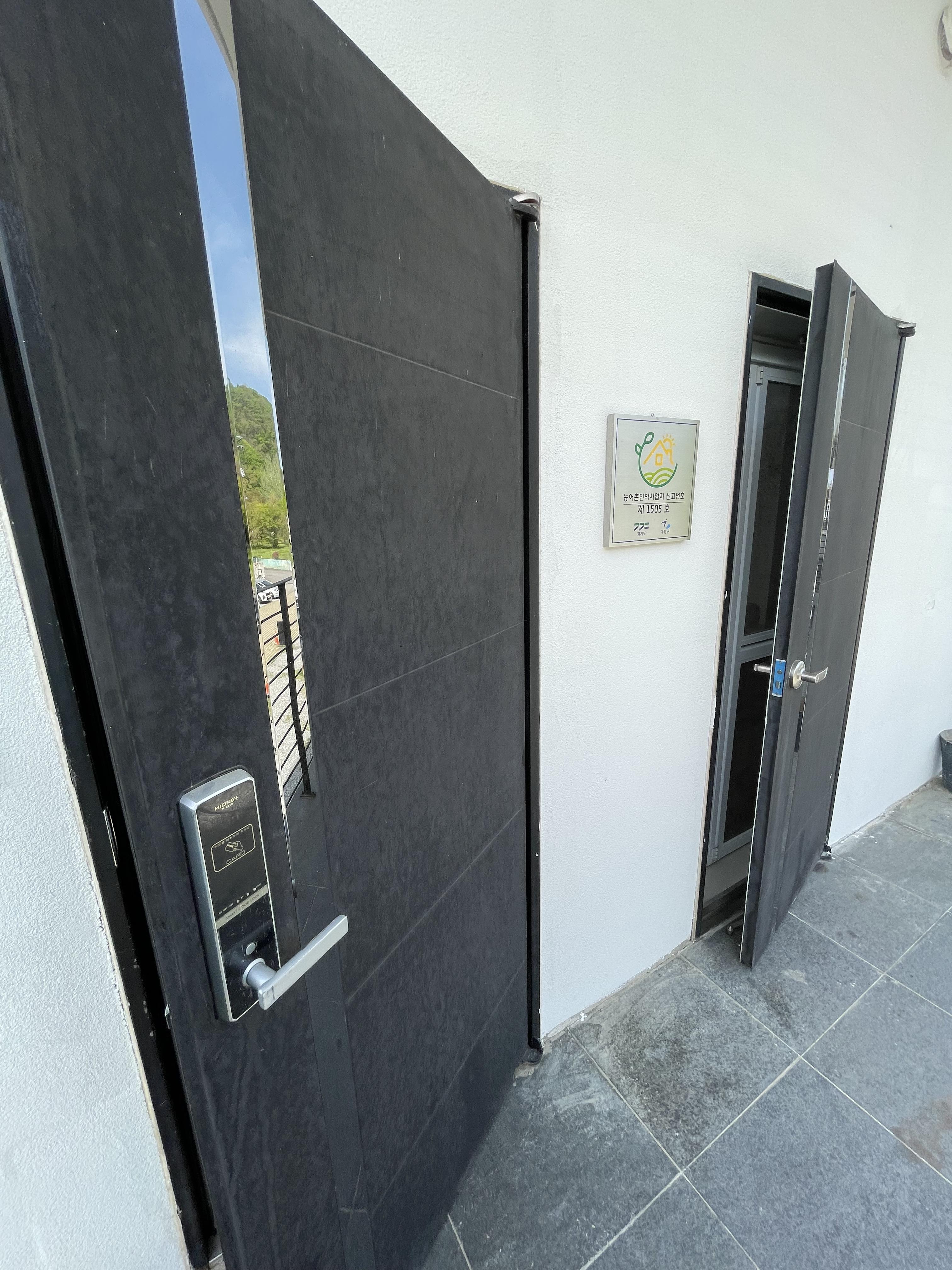 왼쪽에 보이는 문이 계단 있는 문, 오른쪽이 수영장으로 바로 갈 수 있는 문이에요