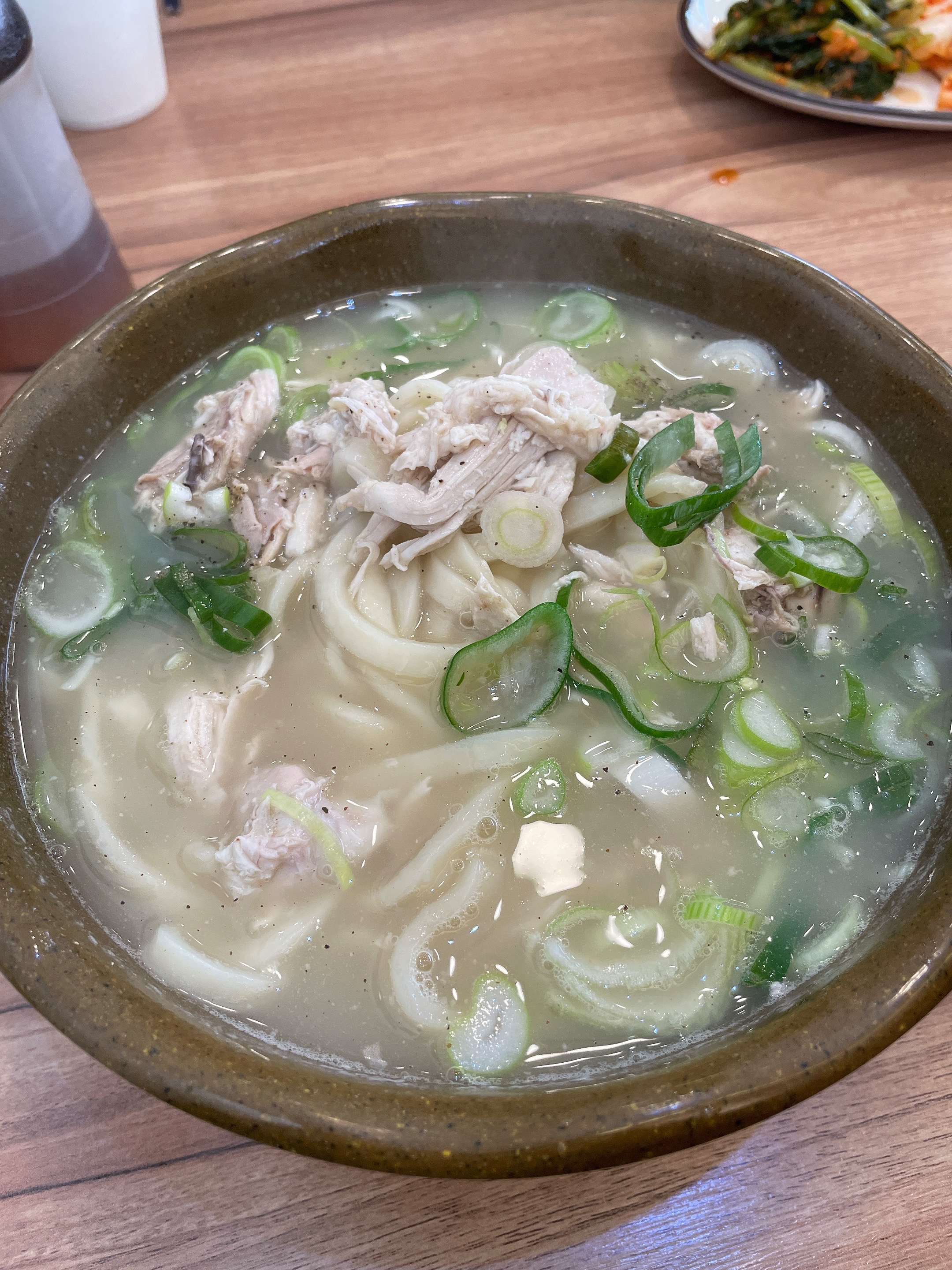 뽀얀 국물에 닭고기와 칼국수 면이 가득이에요