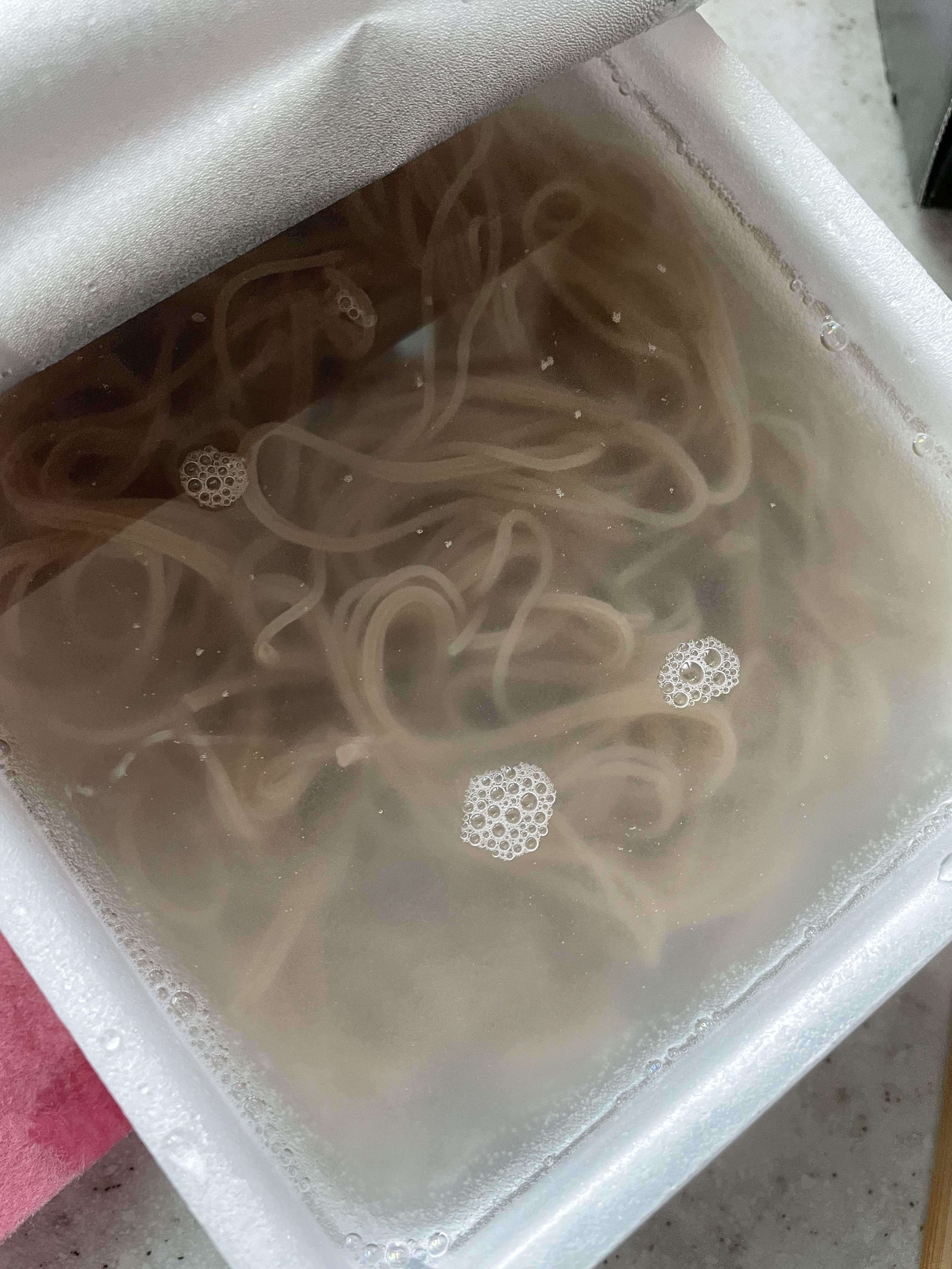 찬물로 한번 헹구면 좋겠다 싶어서 아예 채에다 건졌어요