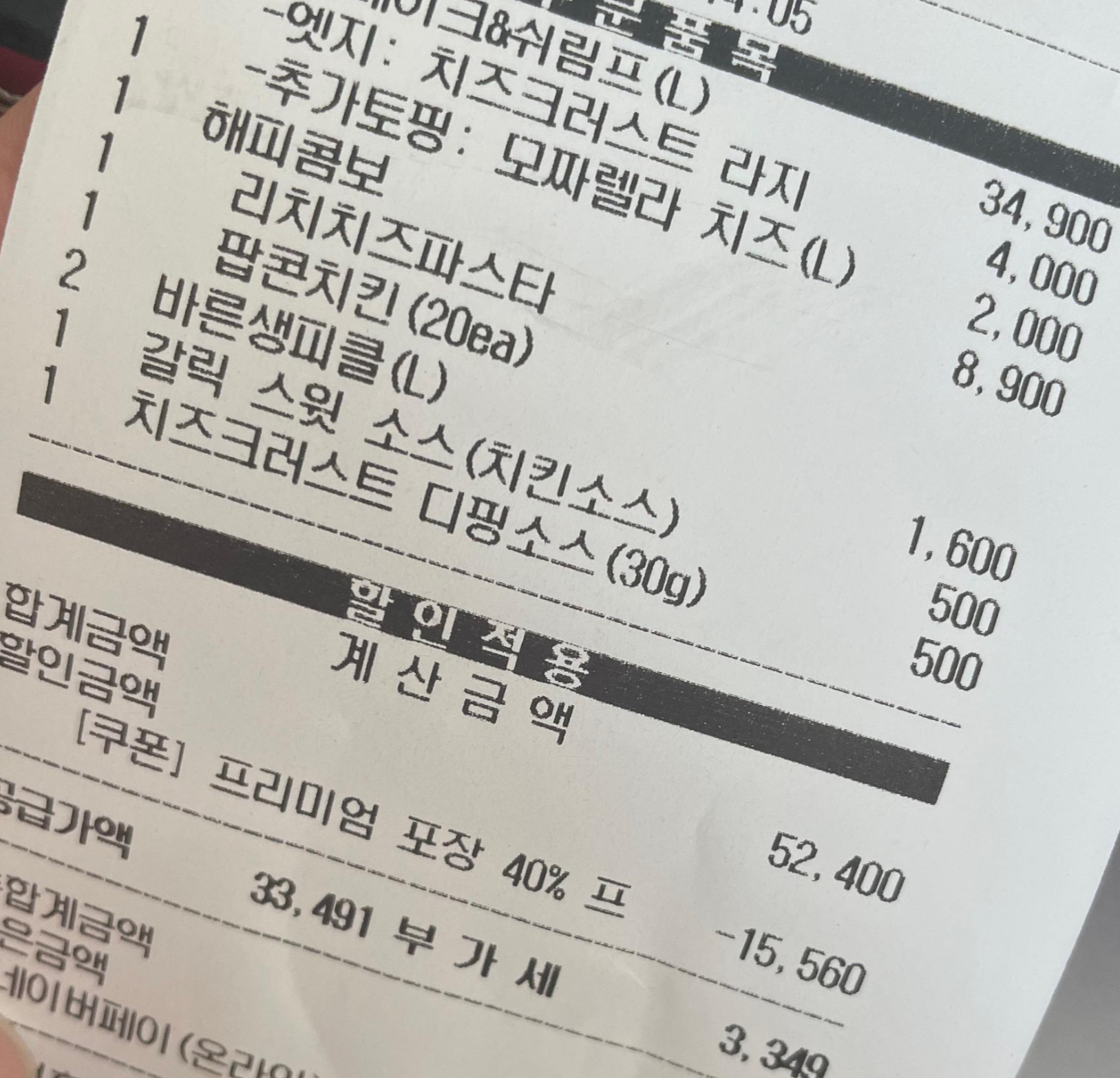 총금액은 52,400원인데 프리미엄 포장으로 할인받아서