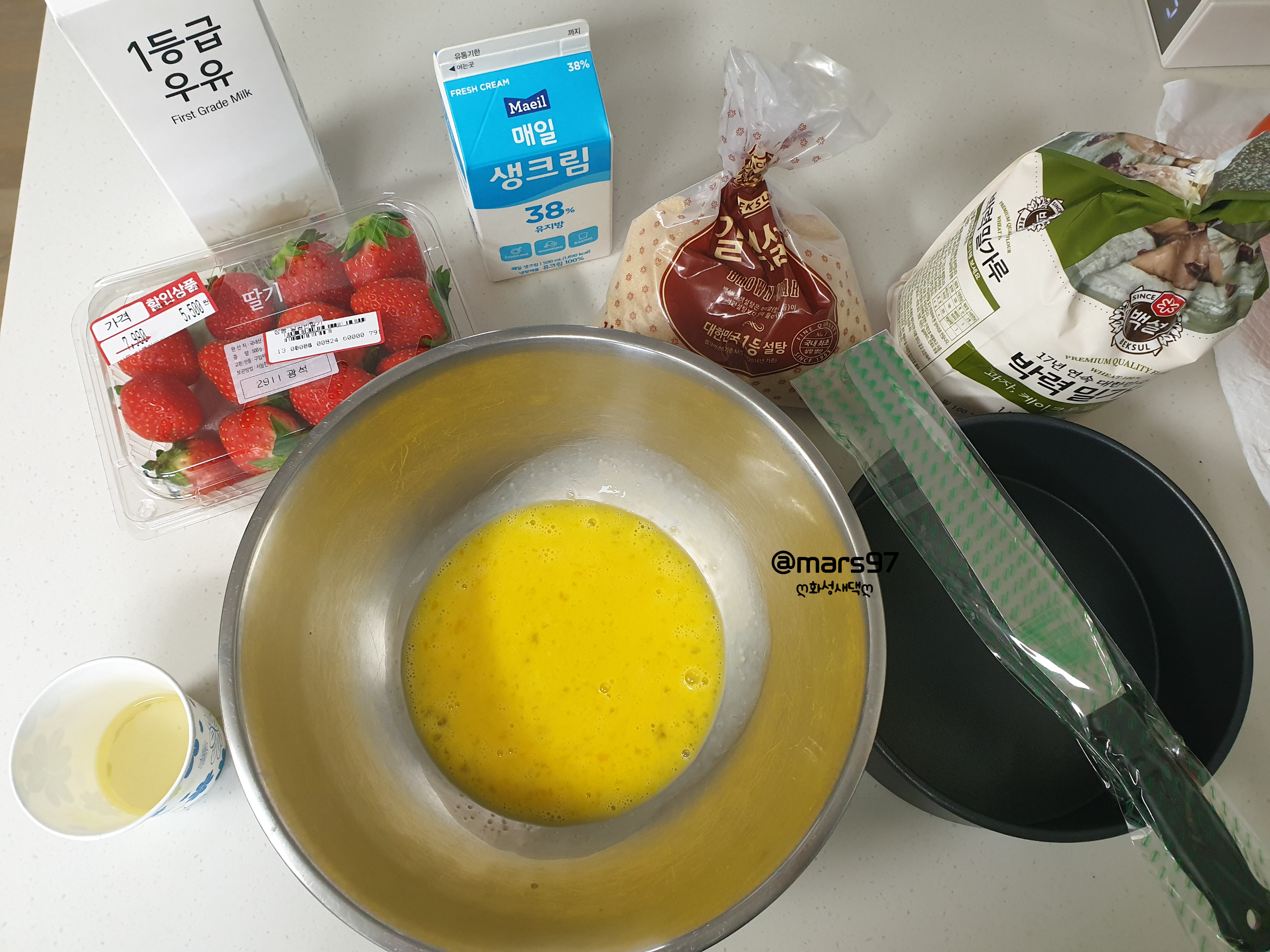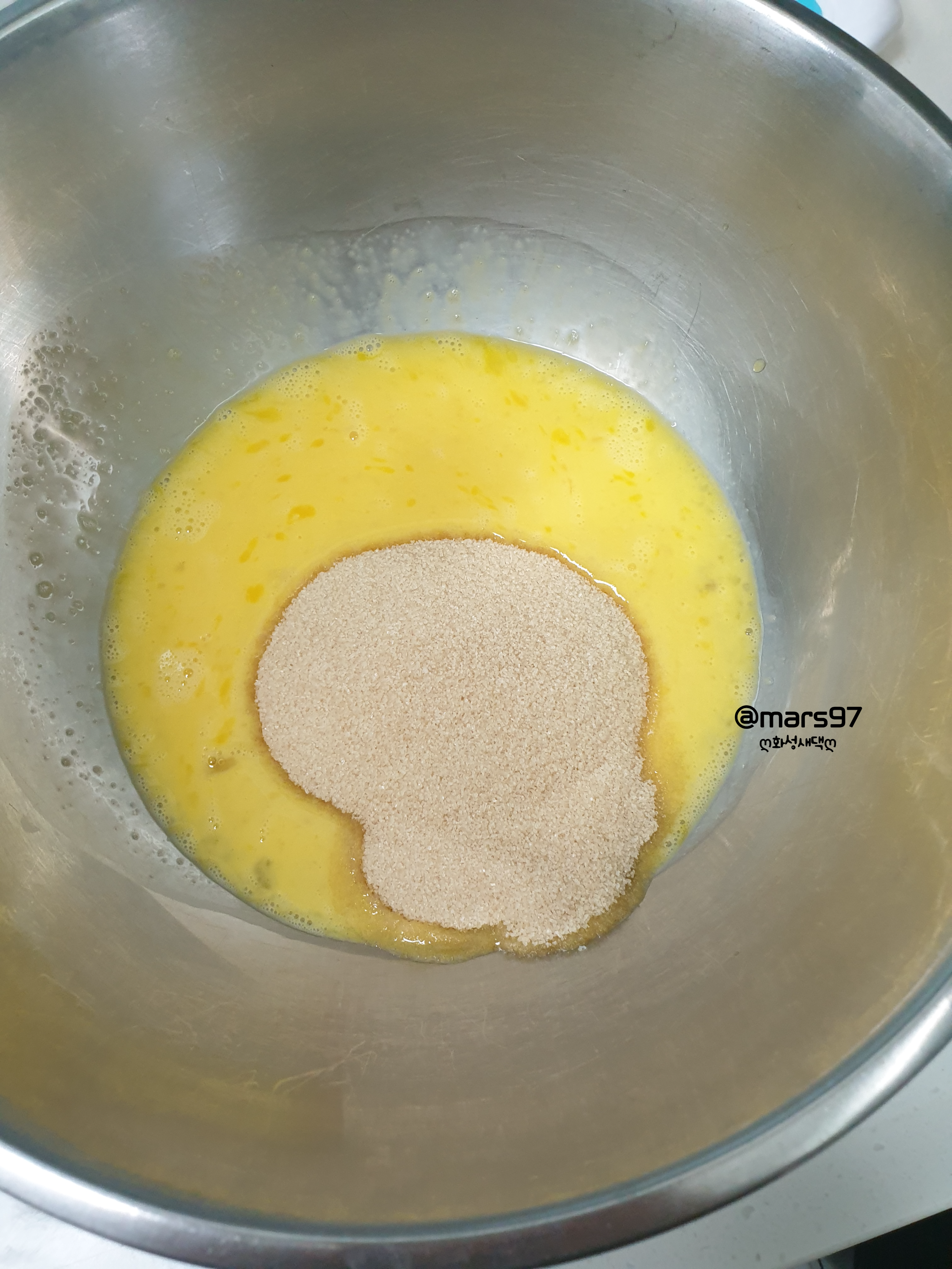 그 위에 계란에 설탕을 넣고 휘핑해주세요