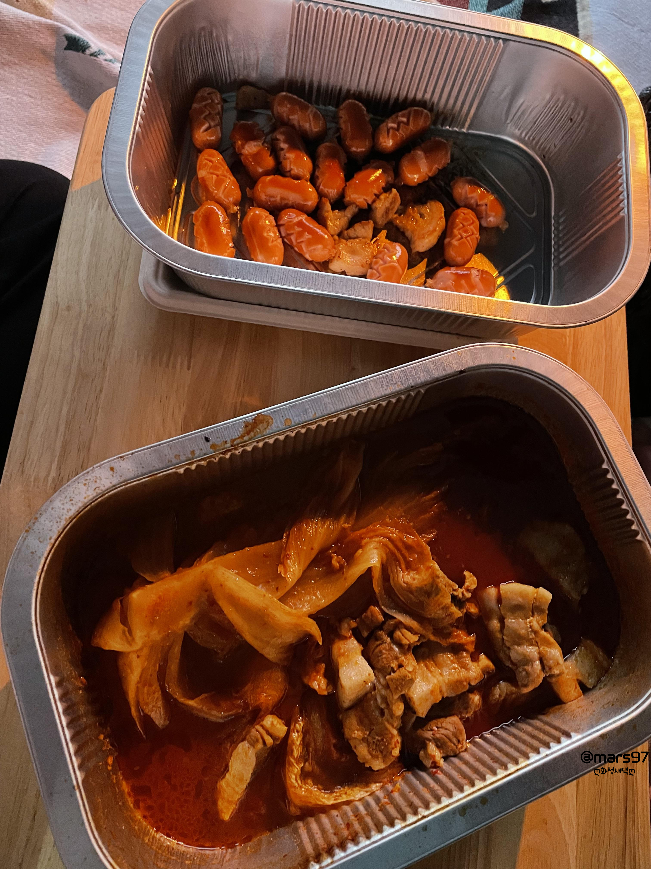 저녁 메뉴는 근처 마트에서 구매한 묵은지찜과 비앤나 소세지 에요