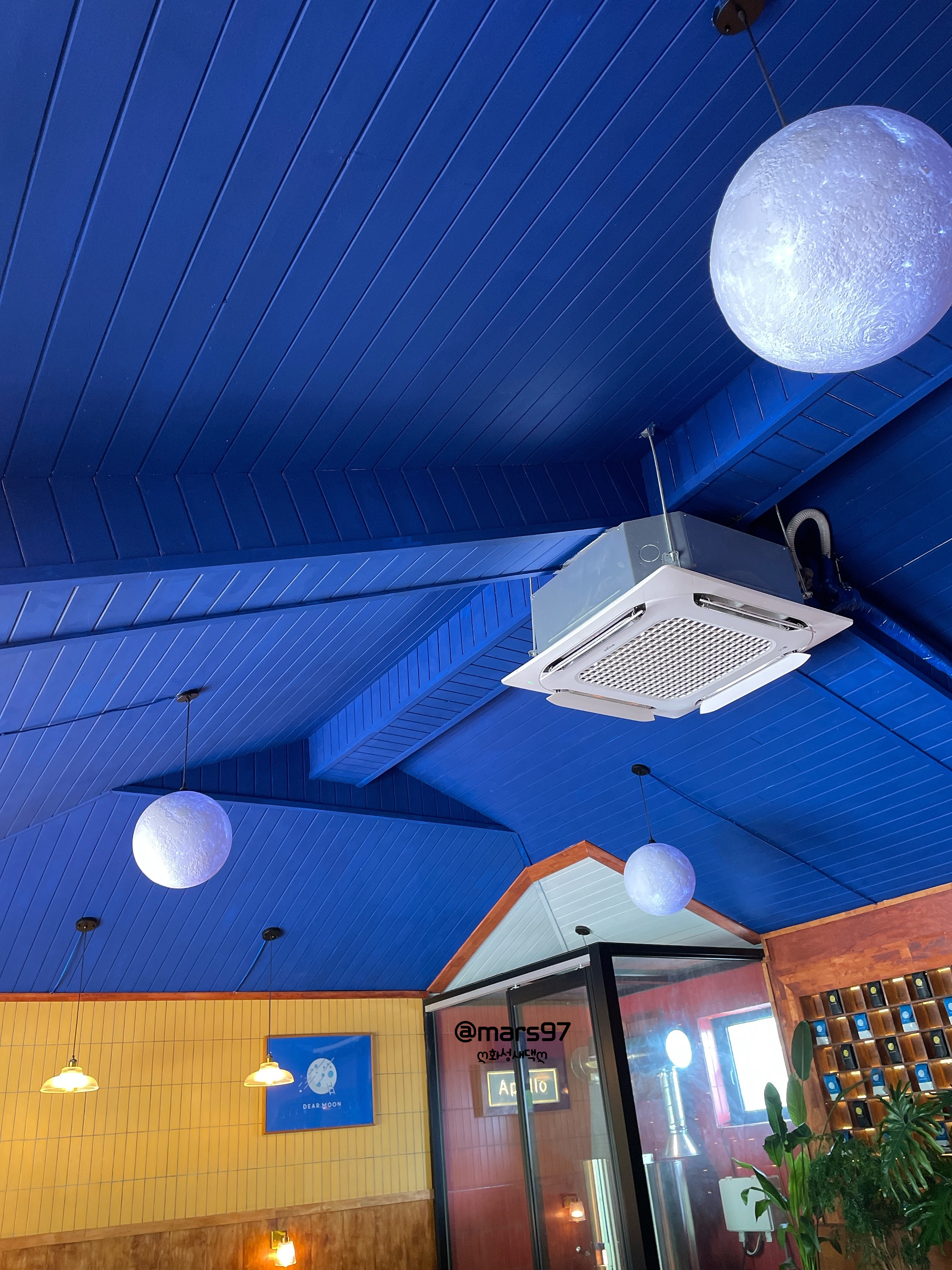 파아란 천장에 달 모양 전구가 달려 있어요