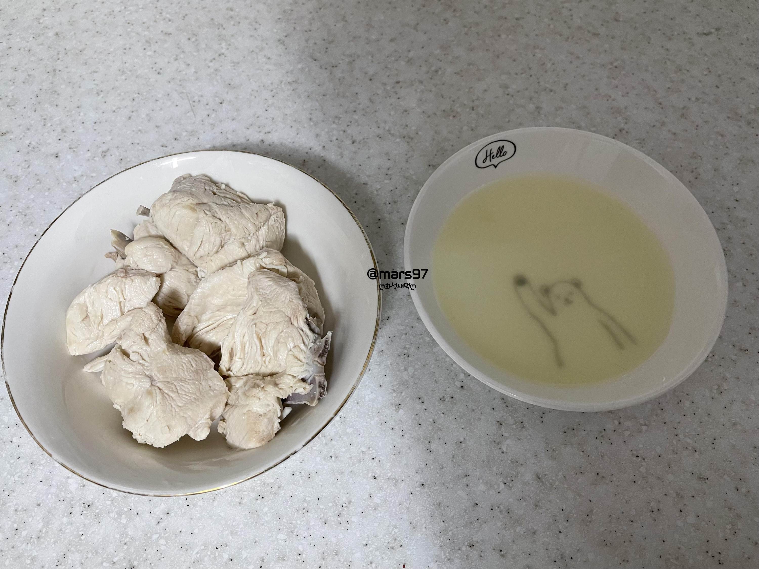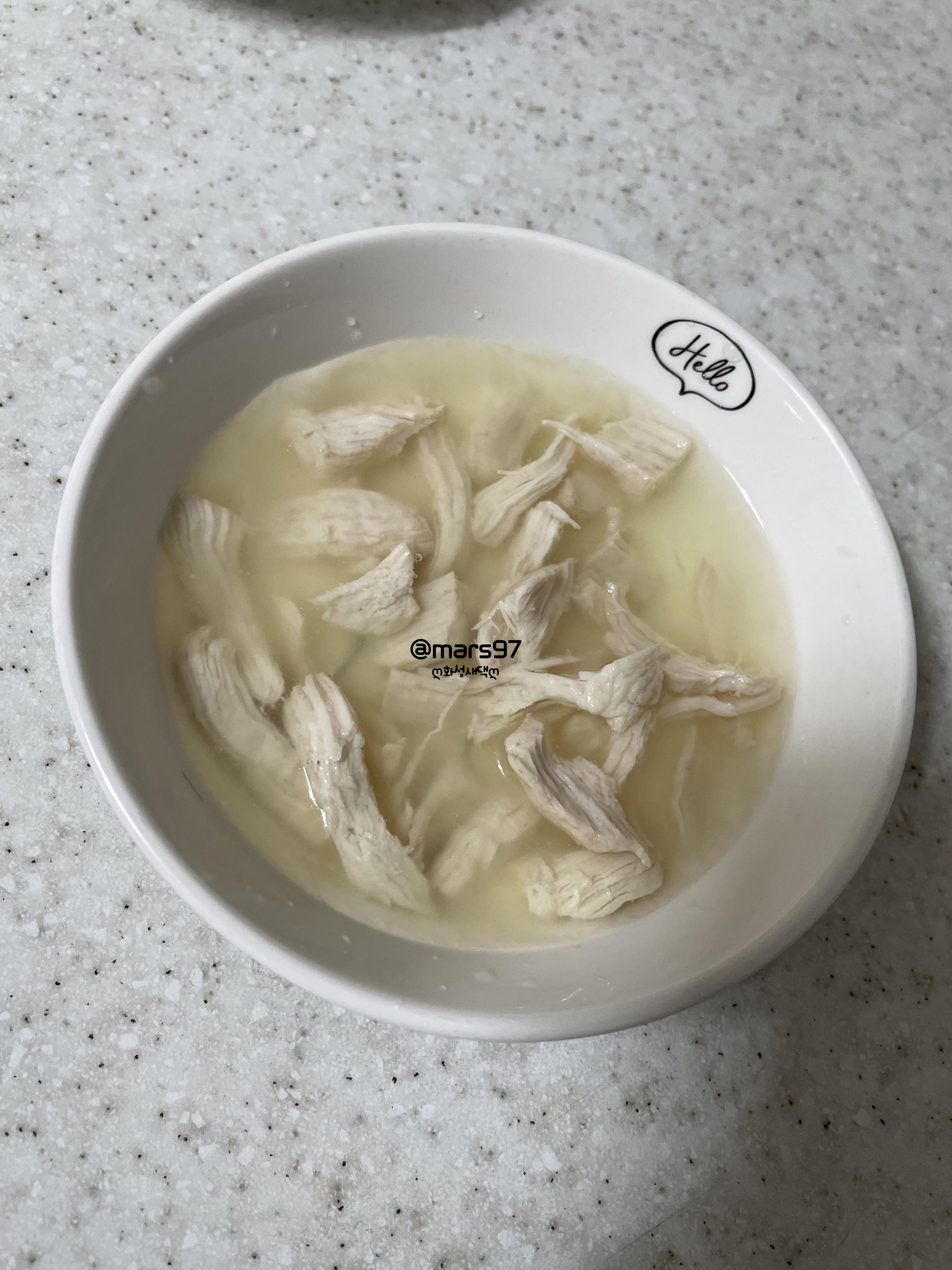 잘 삶아진 닭가슴살을 먹기 좋게 찢어