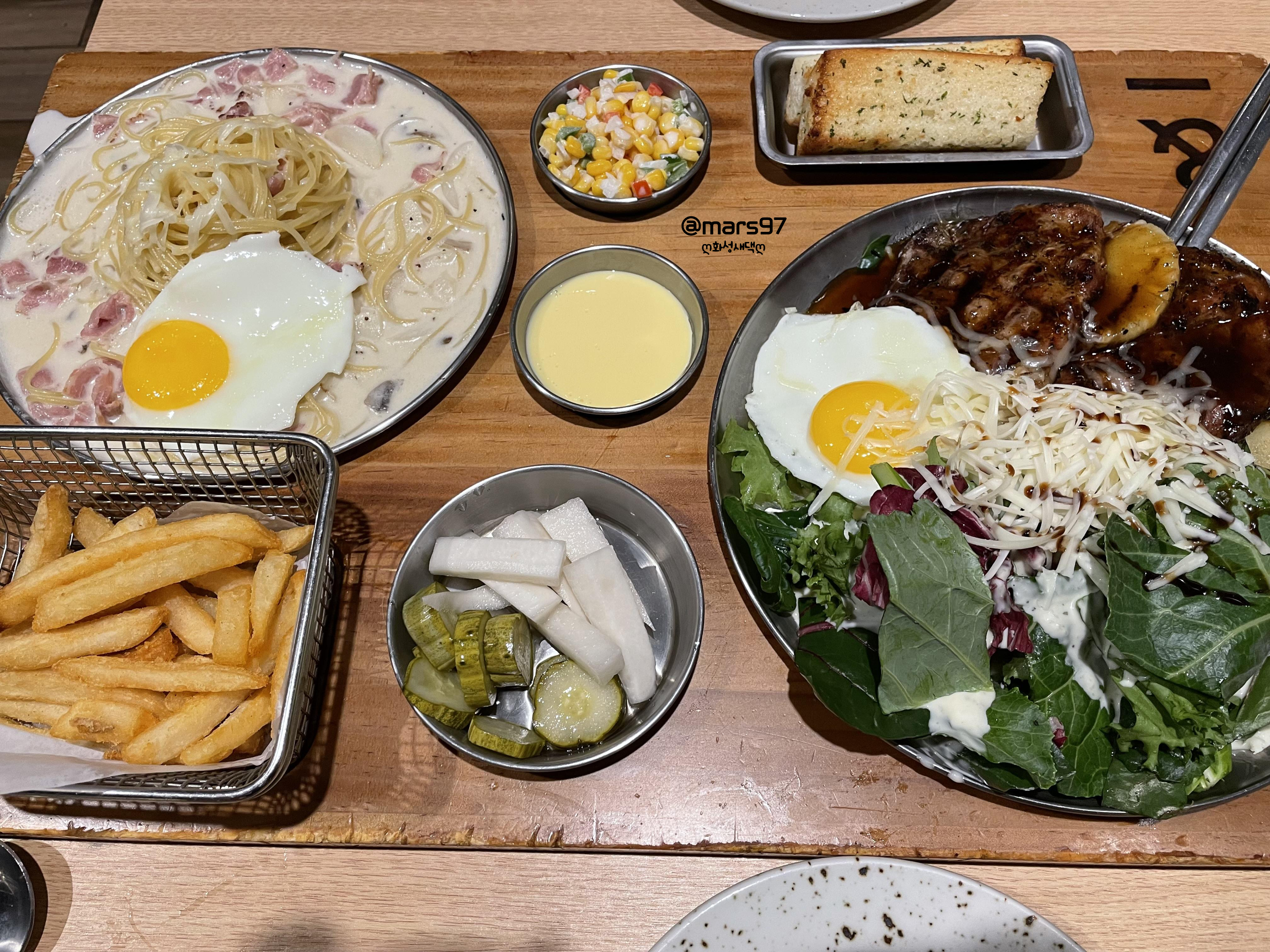 메뉴는 오랜만에 목살 스테이크와 베이컨 까르보나라로 주문했어요