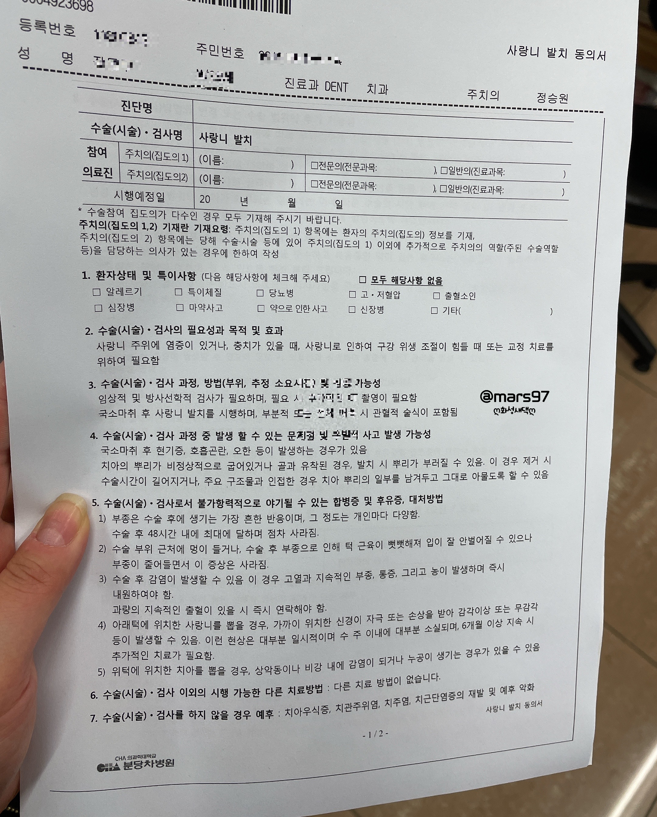 사랑니 발치 동의서와 기타 질병이 있는지에 대한 문진표를 작성하더라고요