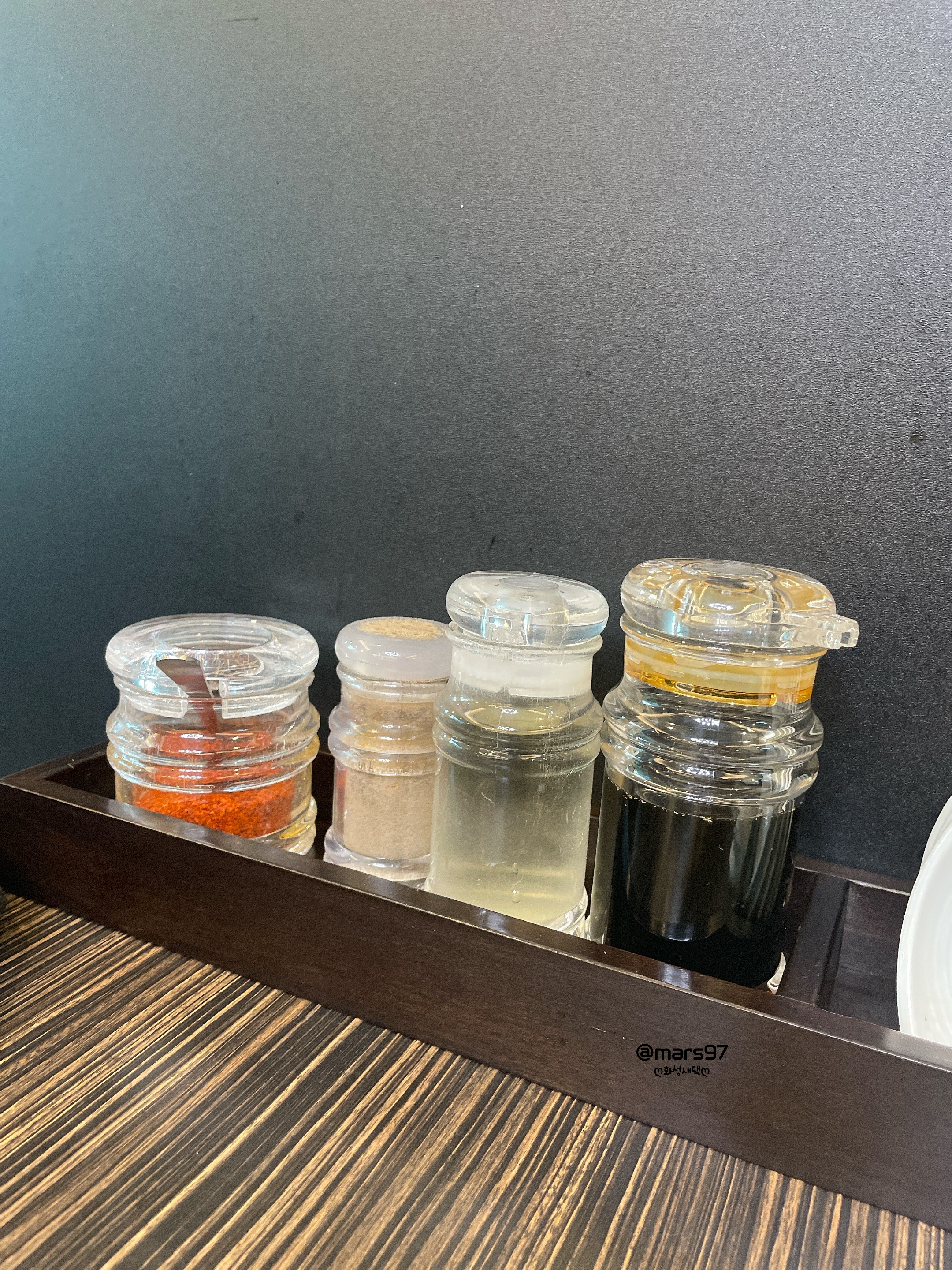 고춧가루, 후춧가루, 식초, 간장이 놓여 있어요