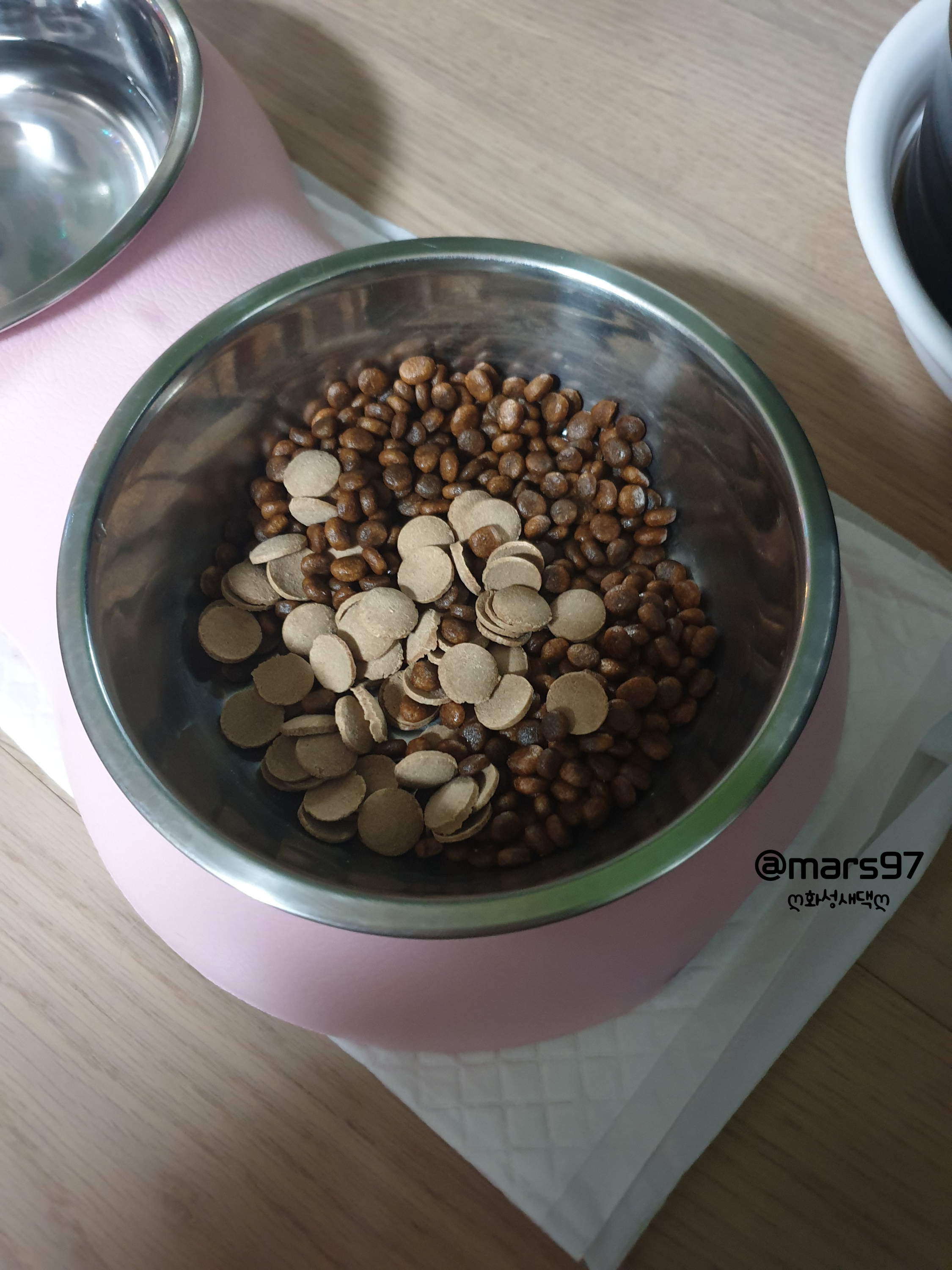 기존에 먹던 사료인 건강백서 말티즈 사료와 조금 섞어서 줘봤어요