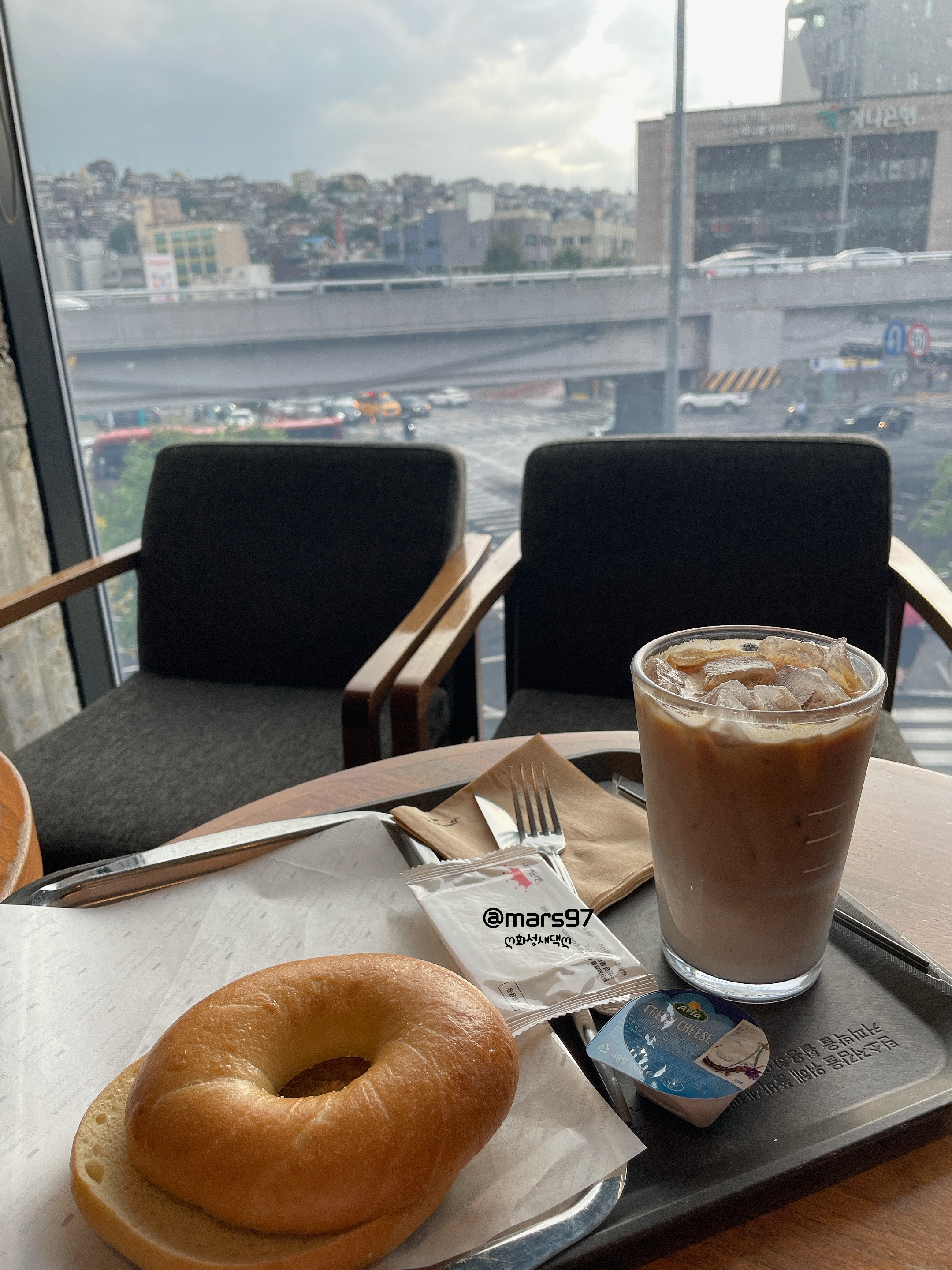 아이스 바닐라 라떼와 플레인 베이글 주문했어요