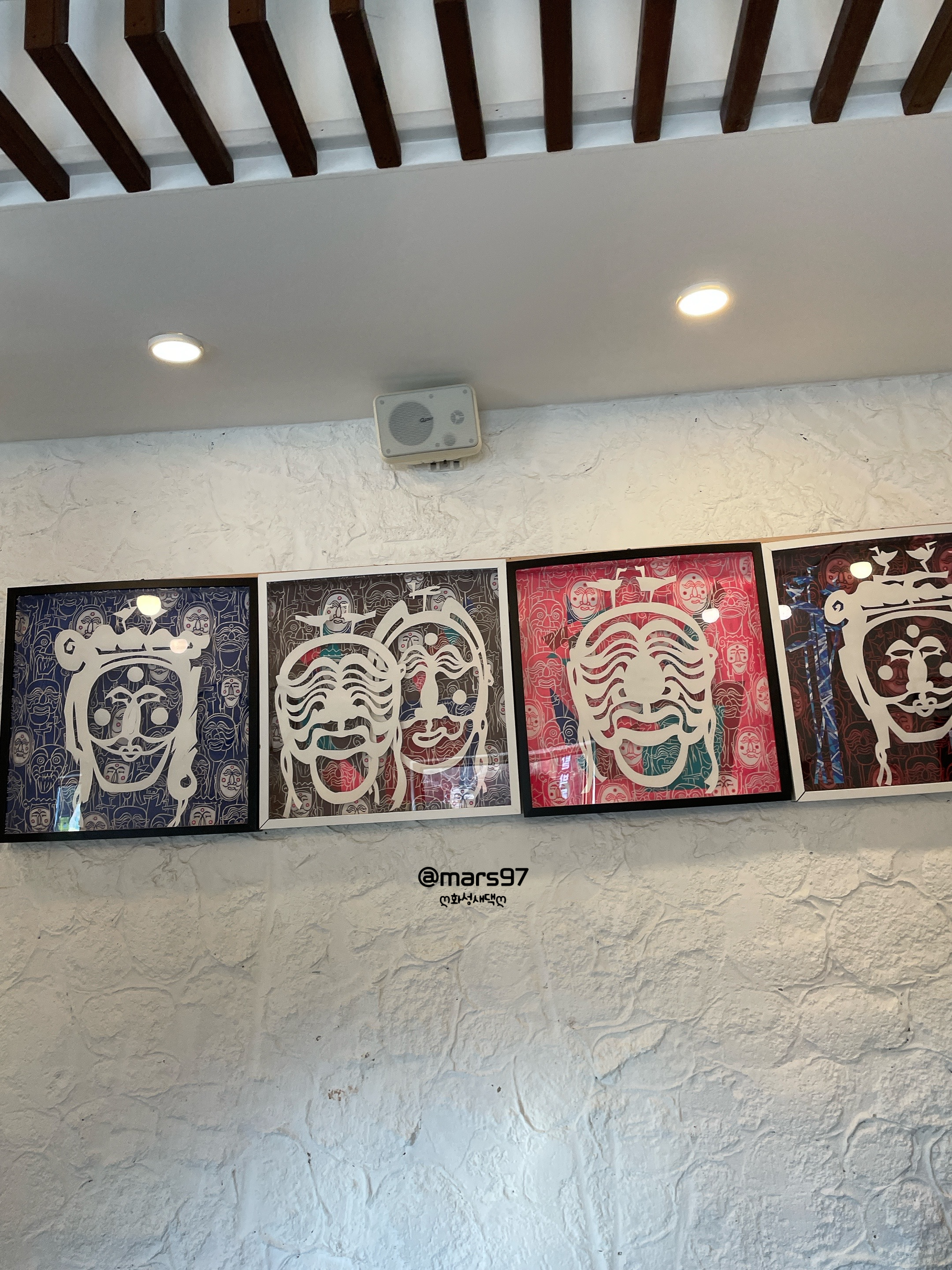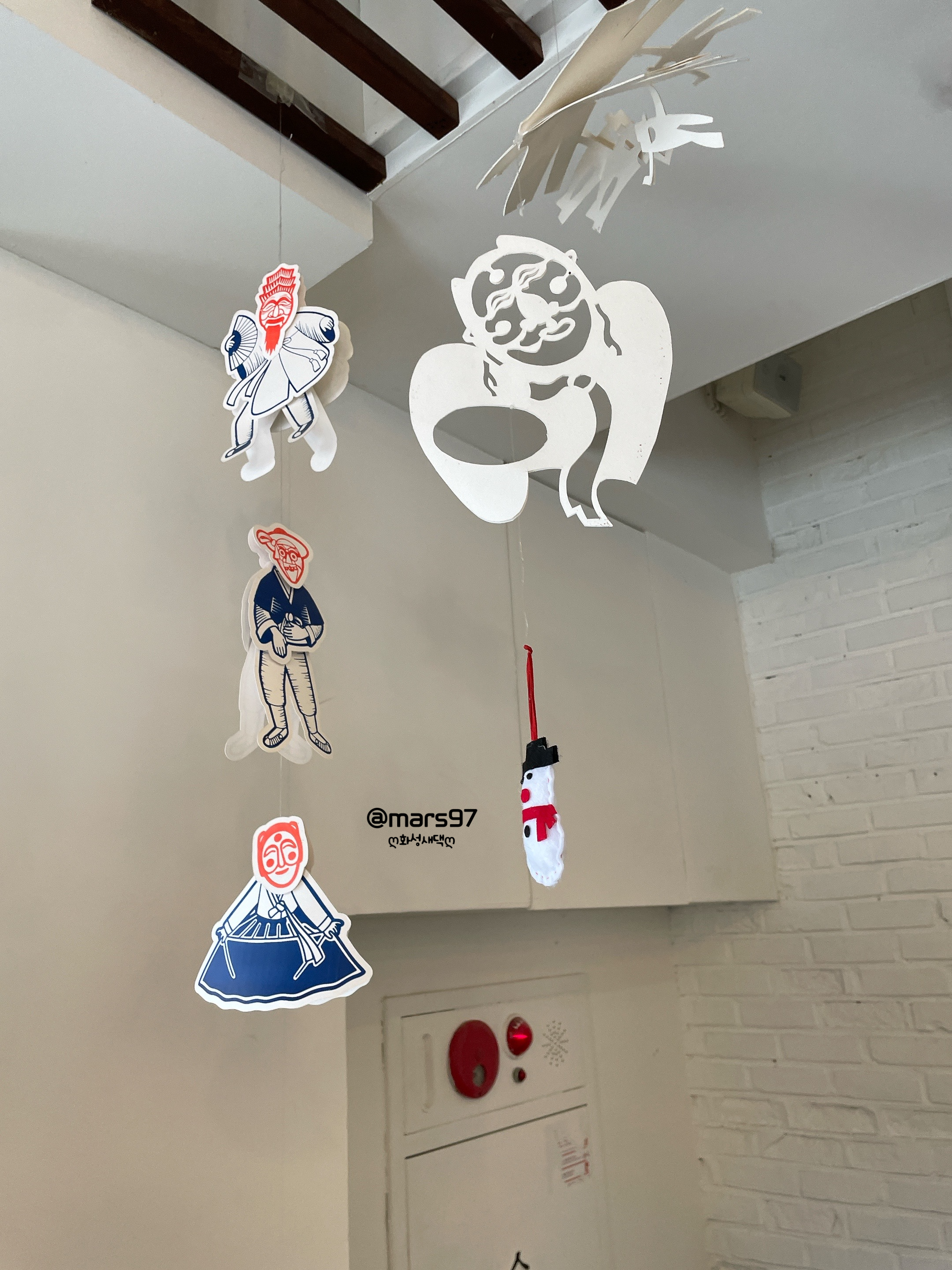 하회탈 그림과 종이가 천장에 달려 있더라고요