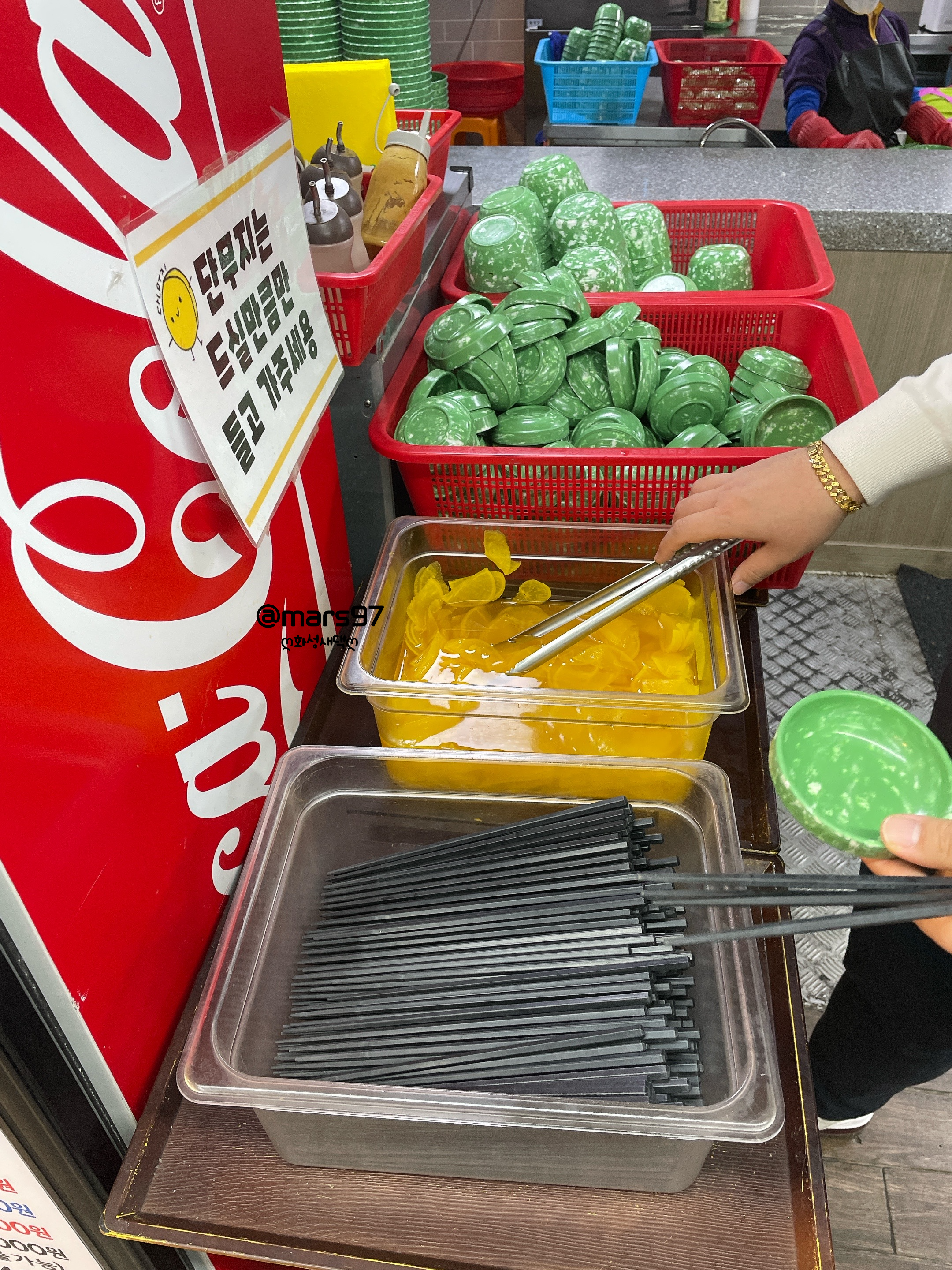 바로 옆쪽에서 단무지와 젓가락과 접시를 챙겨 오면 돼요