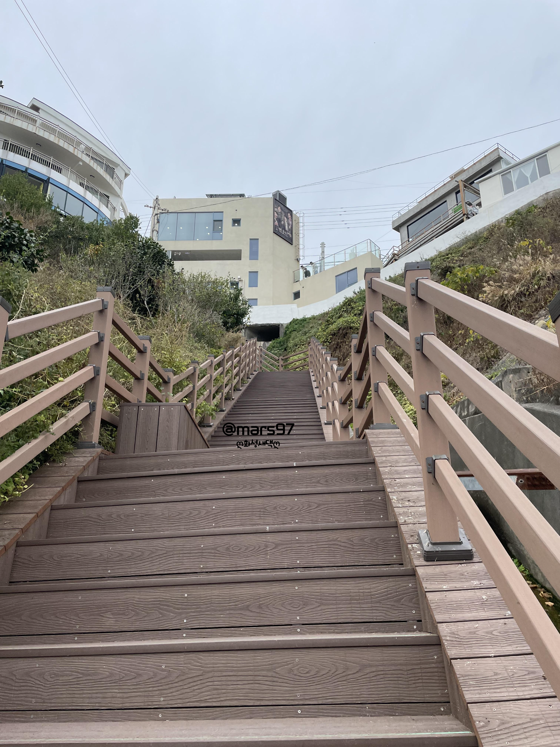 아쉬움을 뒤로한 채 나무계단을 열심히 올라갔어요
