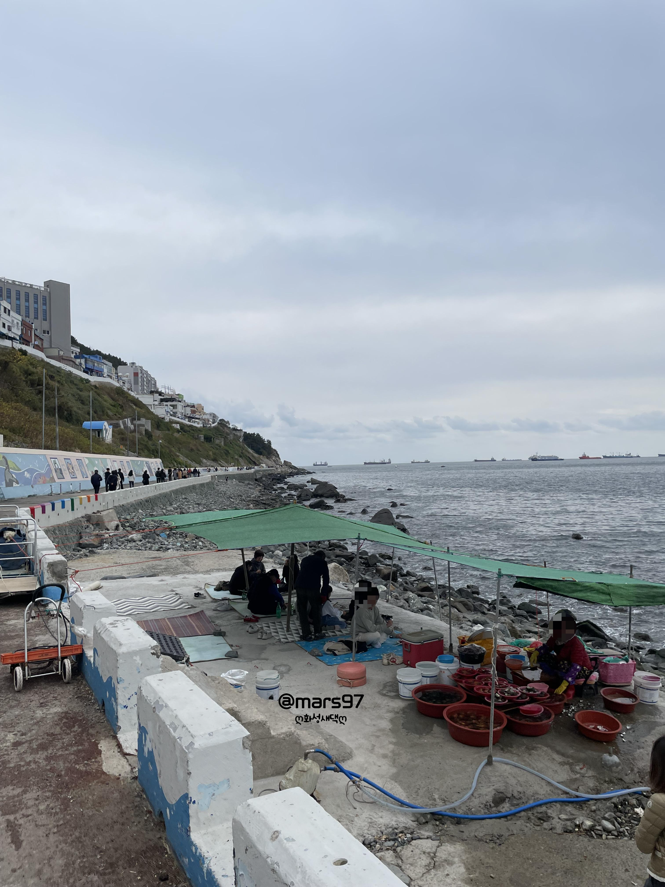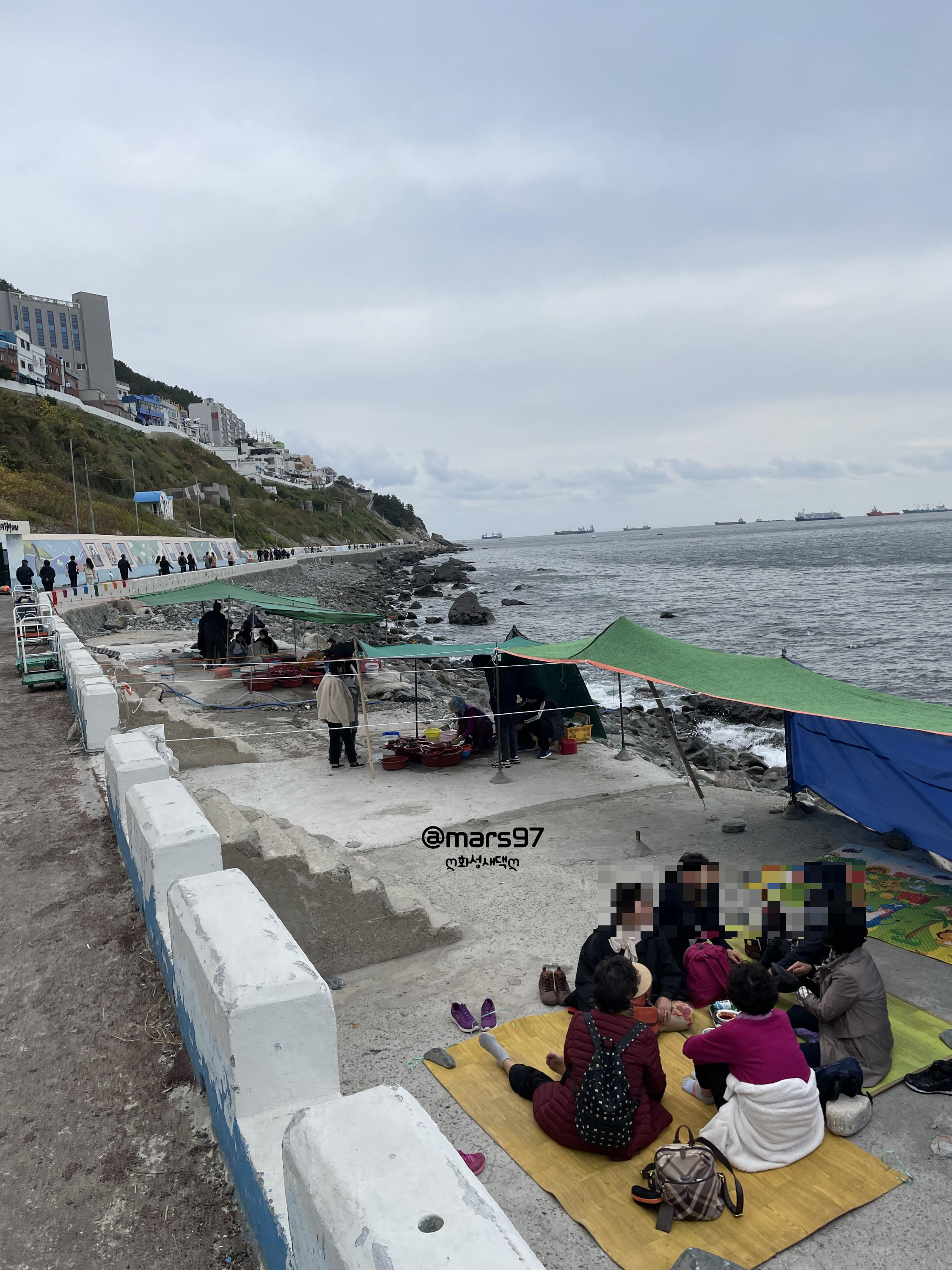 돗자리에 앉아서 싱싱한 해산물이랑 소주 한잔이면~