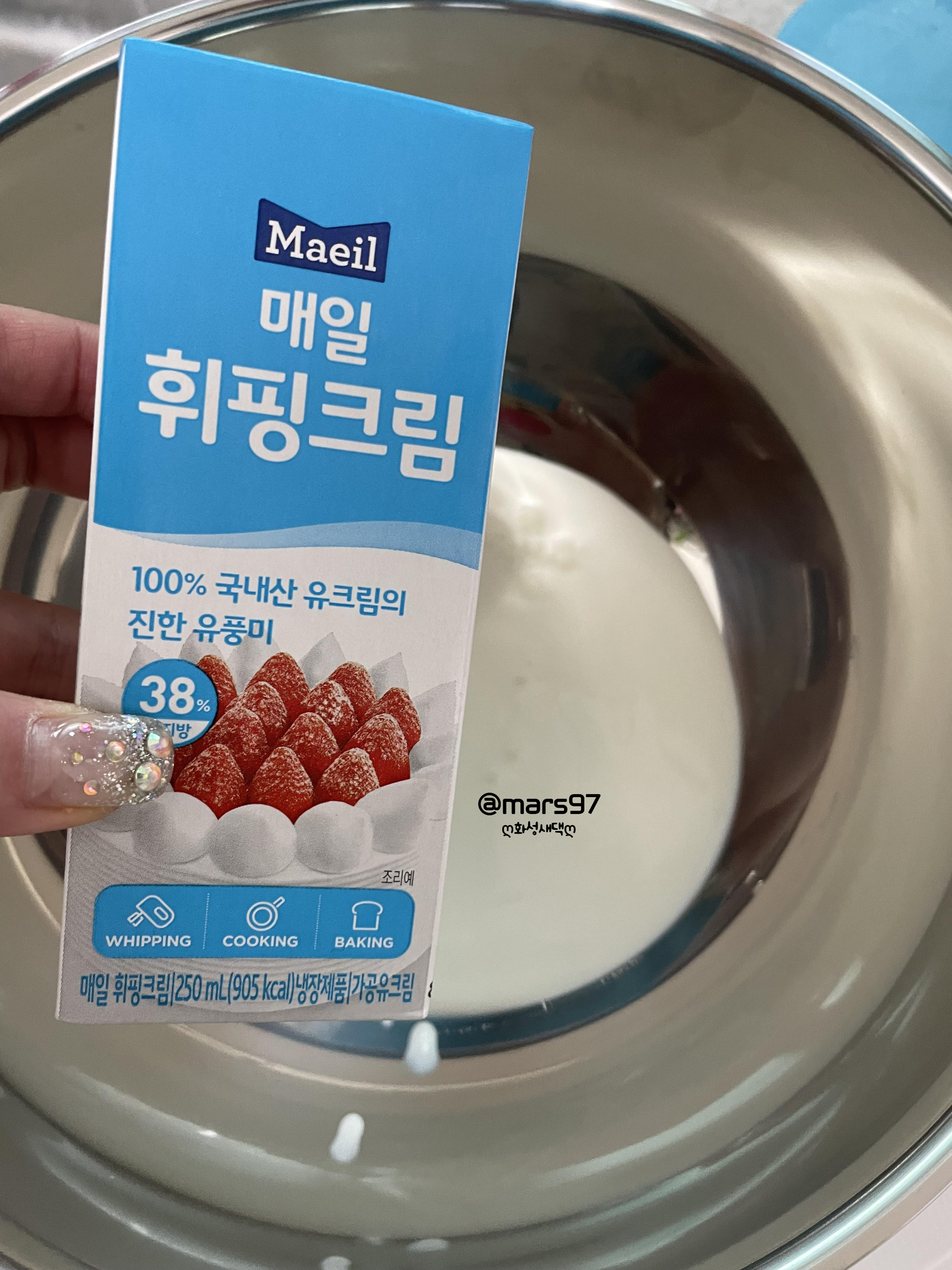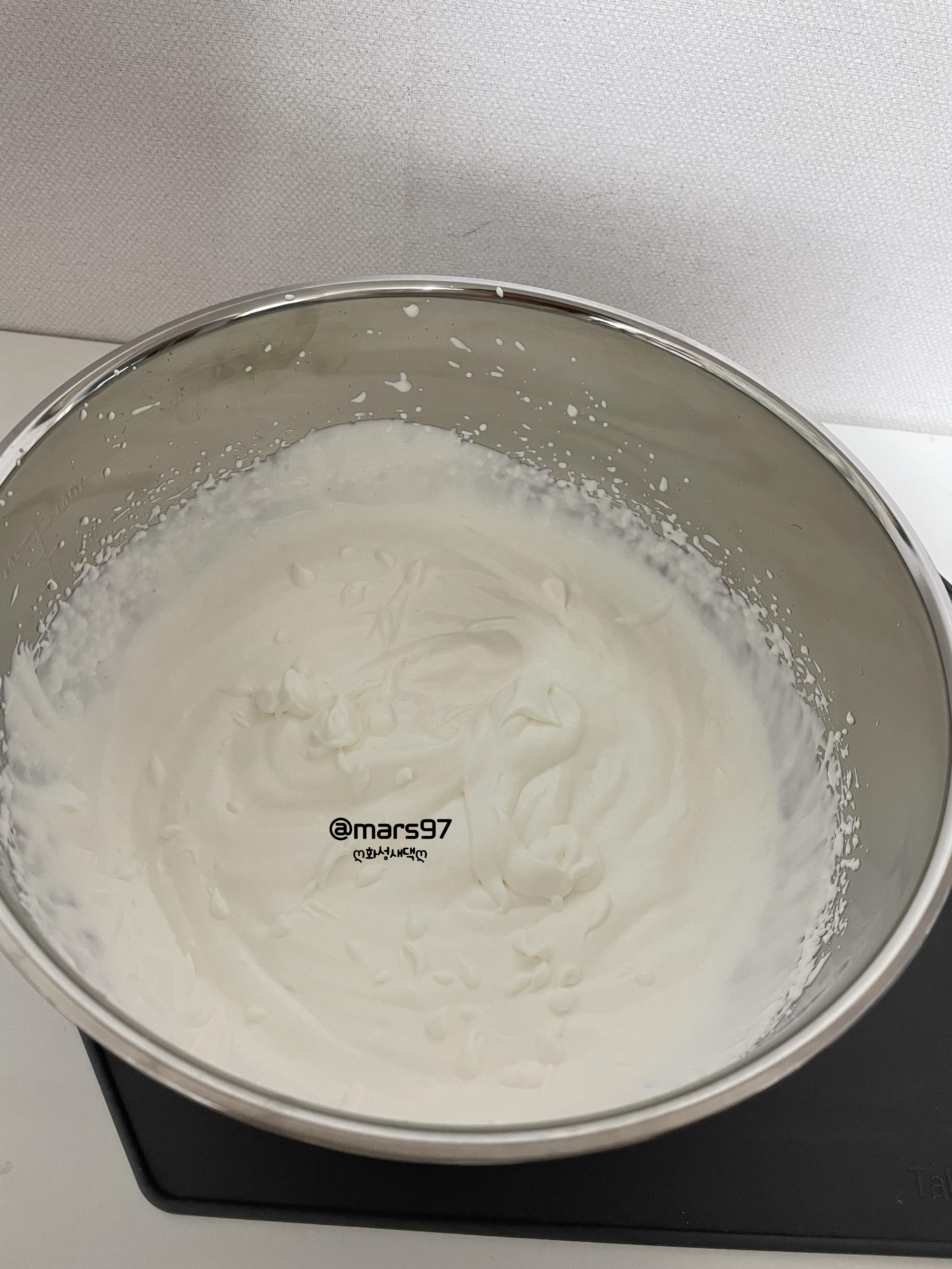 설탕이 안 보이면 미리 만들어 두었던 생크림에 넣어 휘핑해주세요