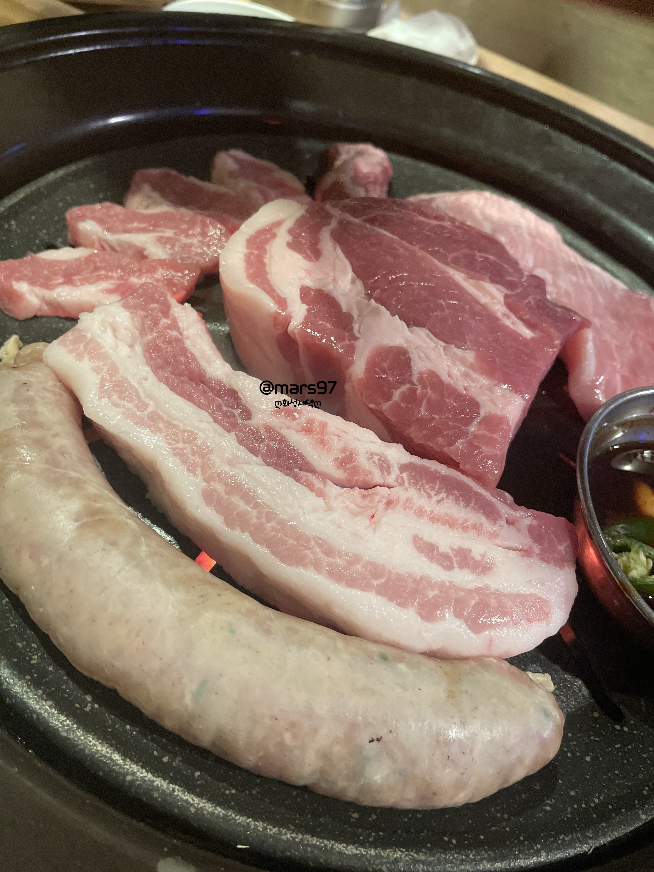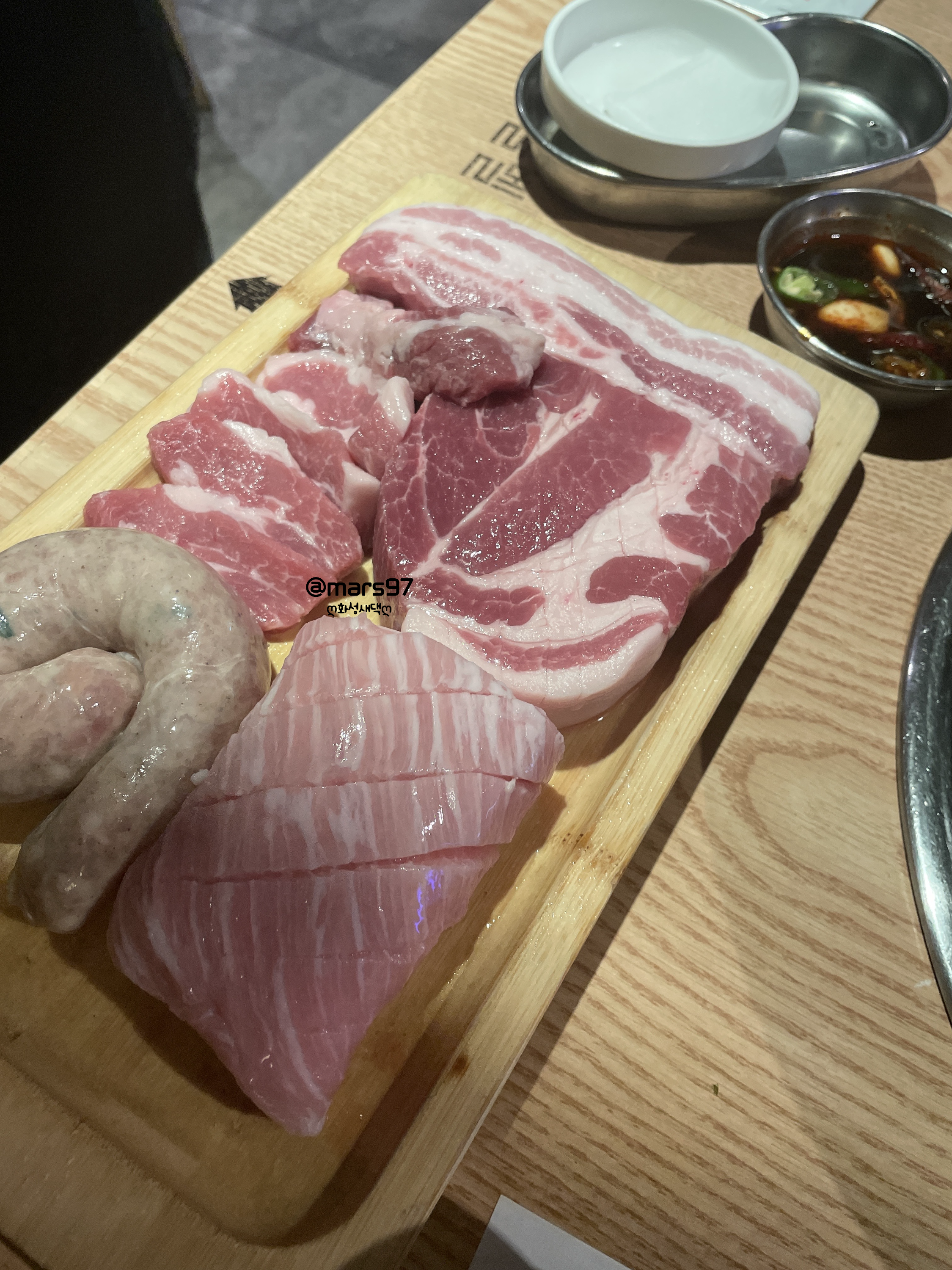 숙성돼지모둠(삼겹살, 목살, 항정살, 가브리살) + 수제소세지