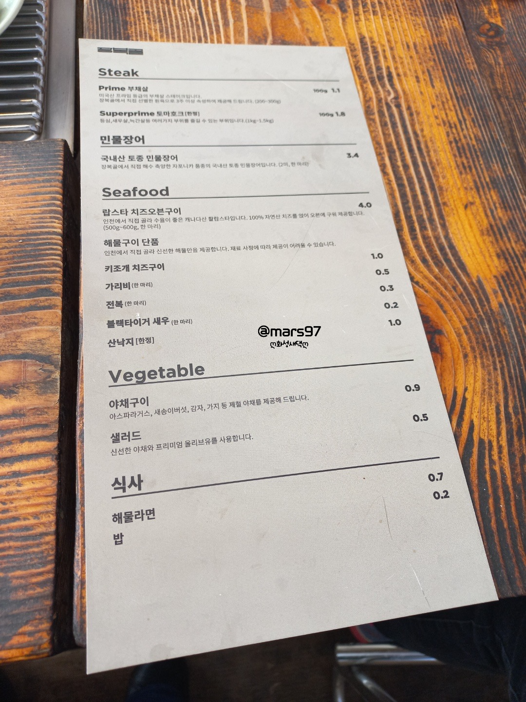 프라임부챗살 스테이크, 국내산 토종 민물장어, 제철해물구이, 조개탕, 랍스터 등 제공