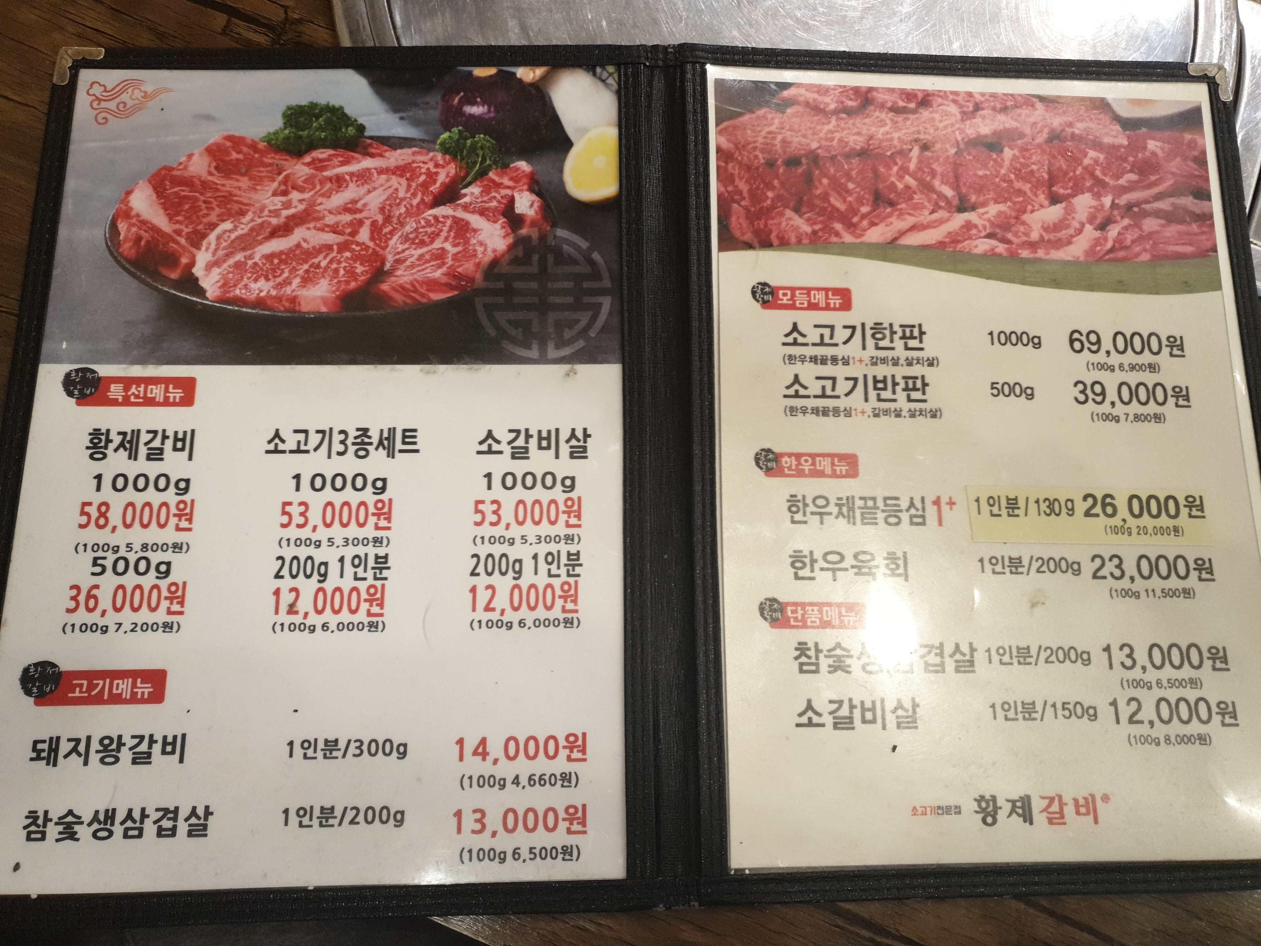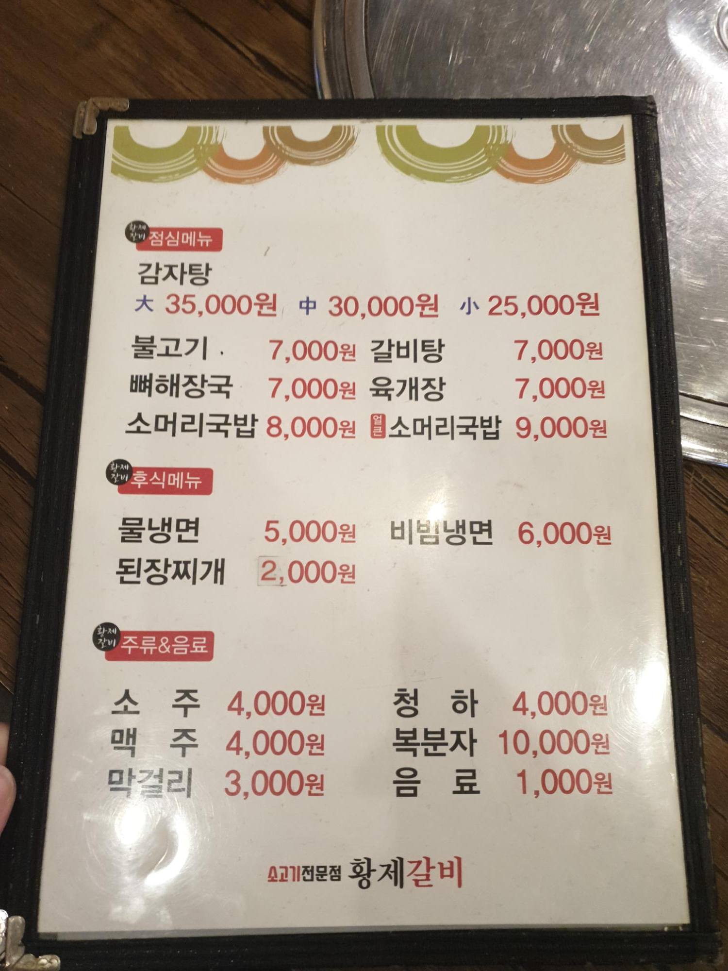 황제 갈비의 메뉴판 이에요