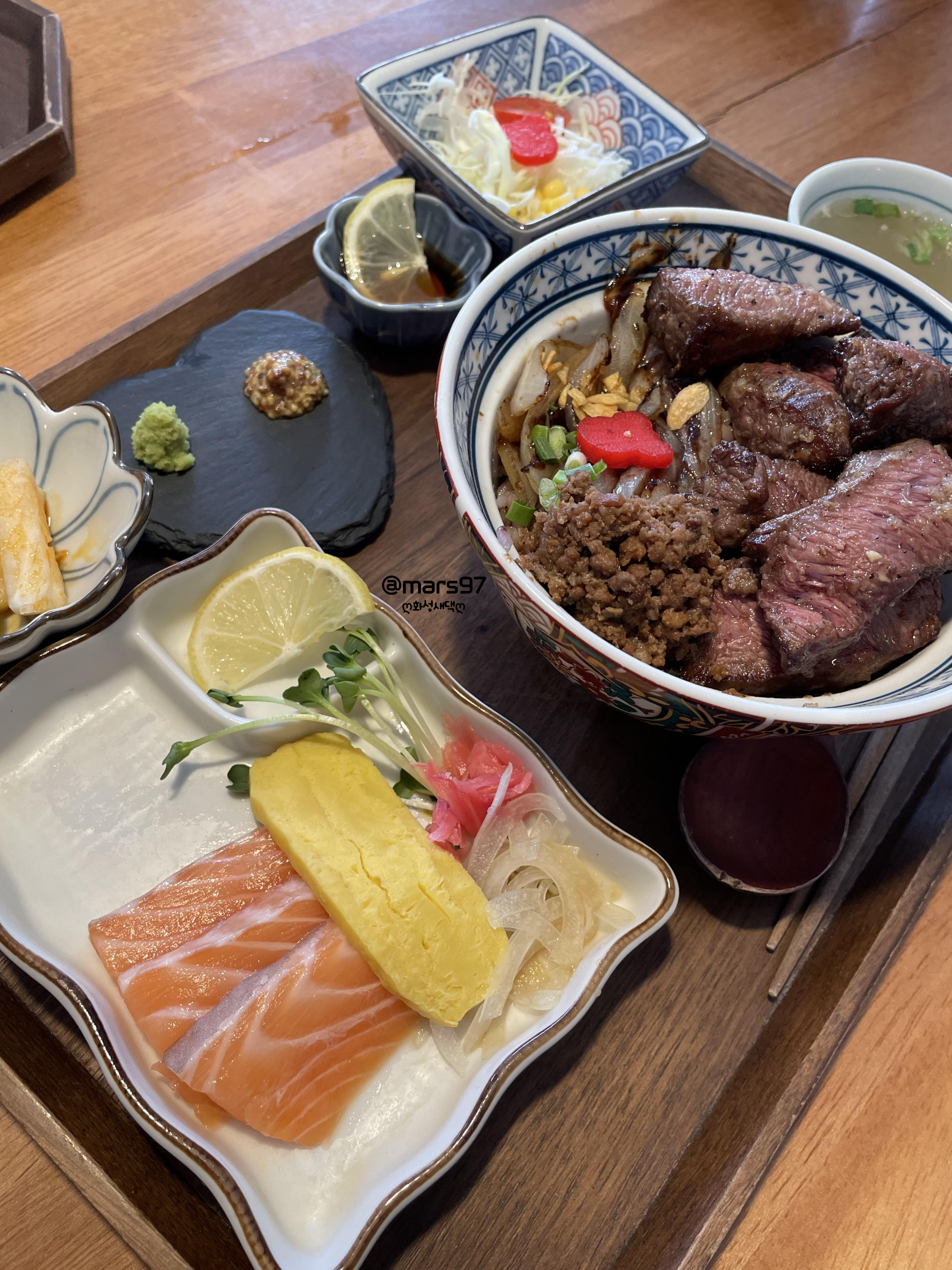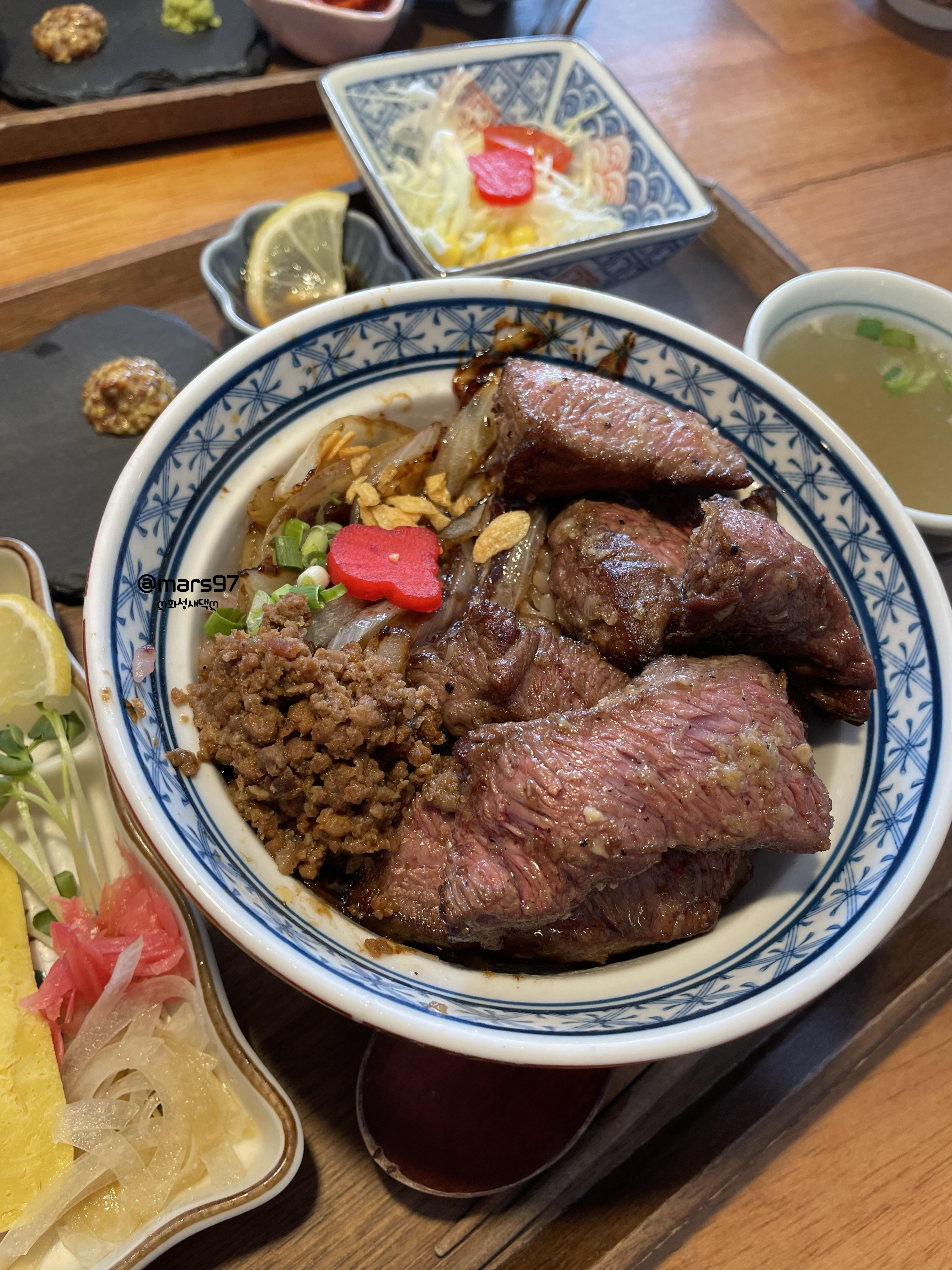 남편님이 주문한 스테이크 소보루동 정식이예요