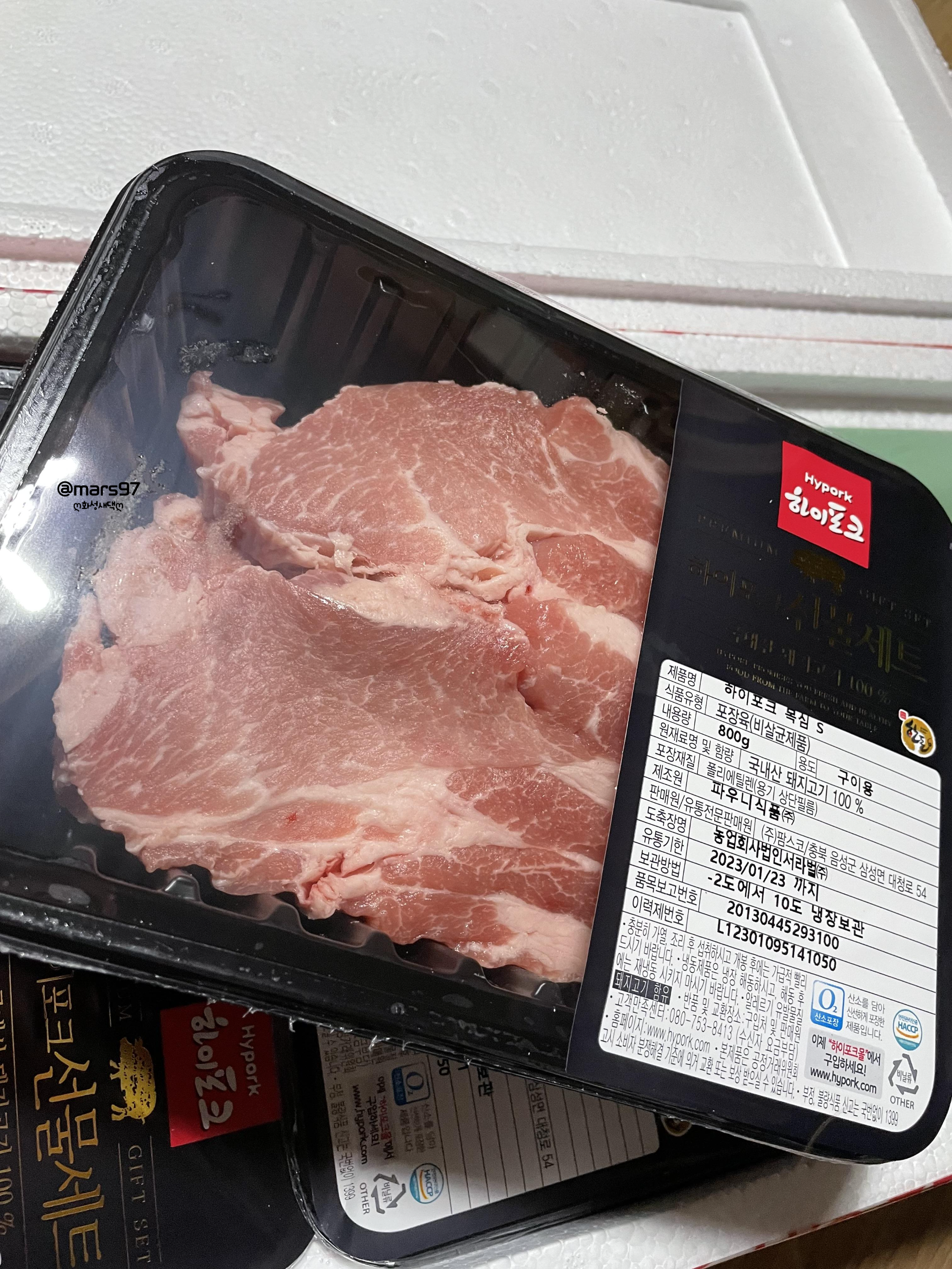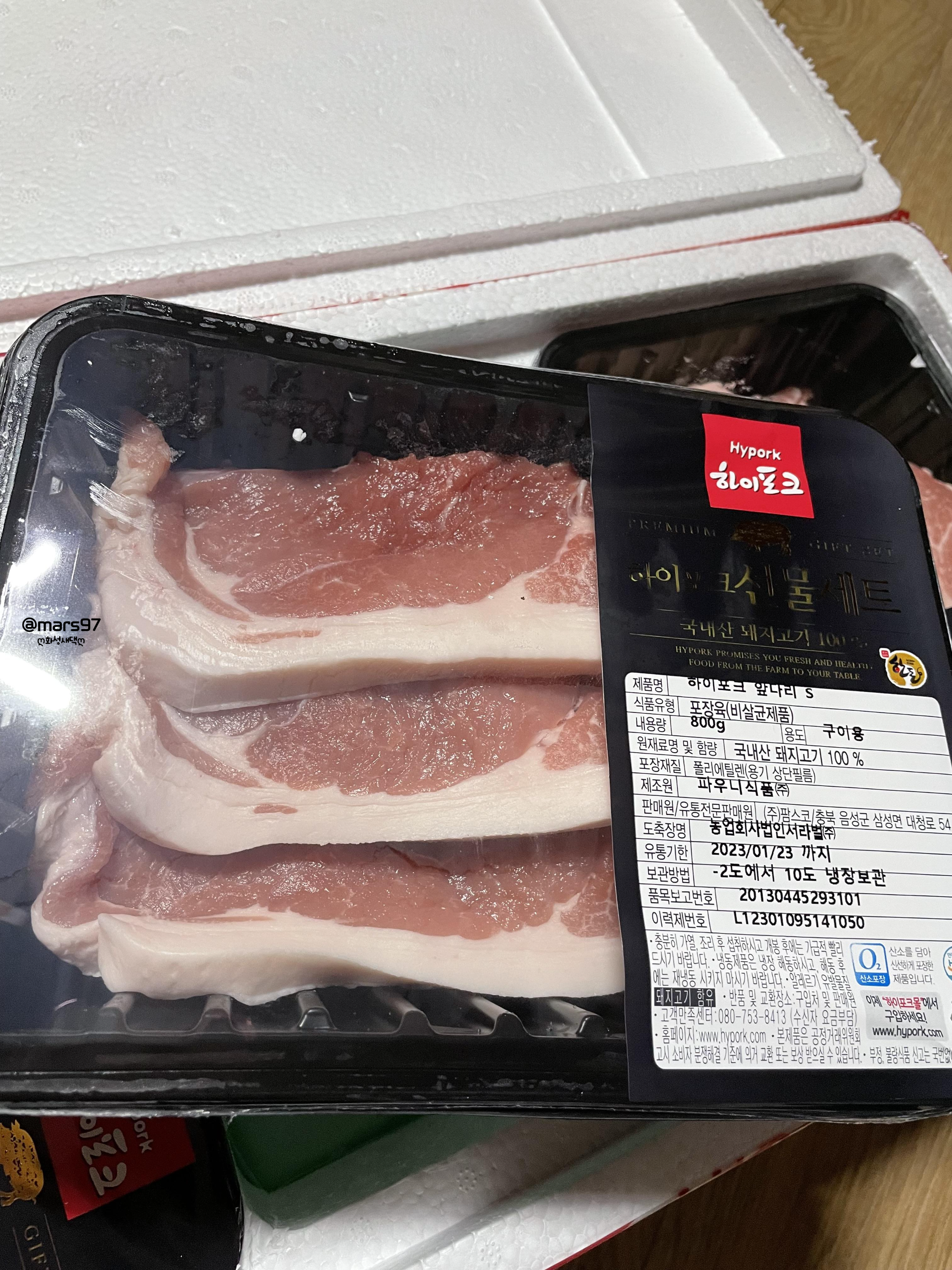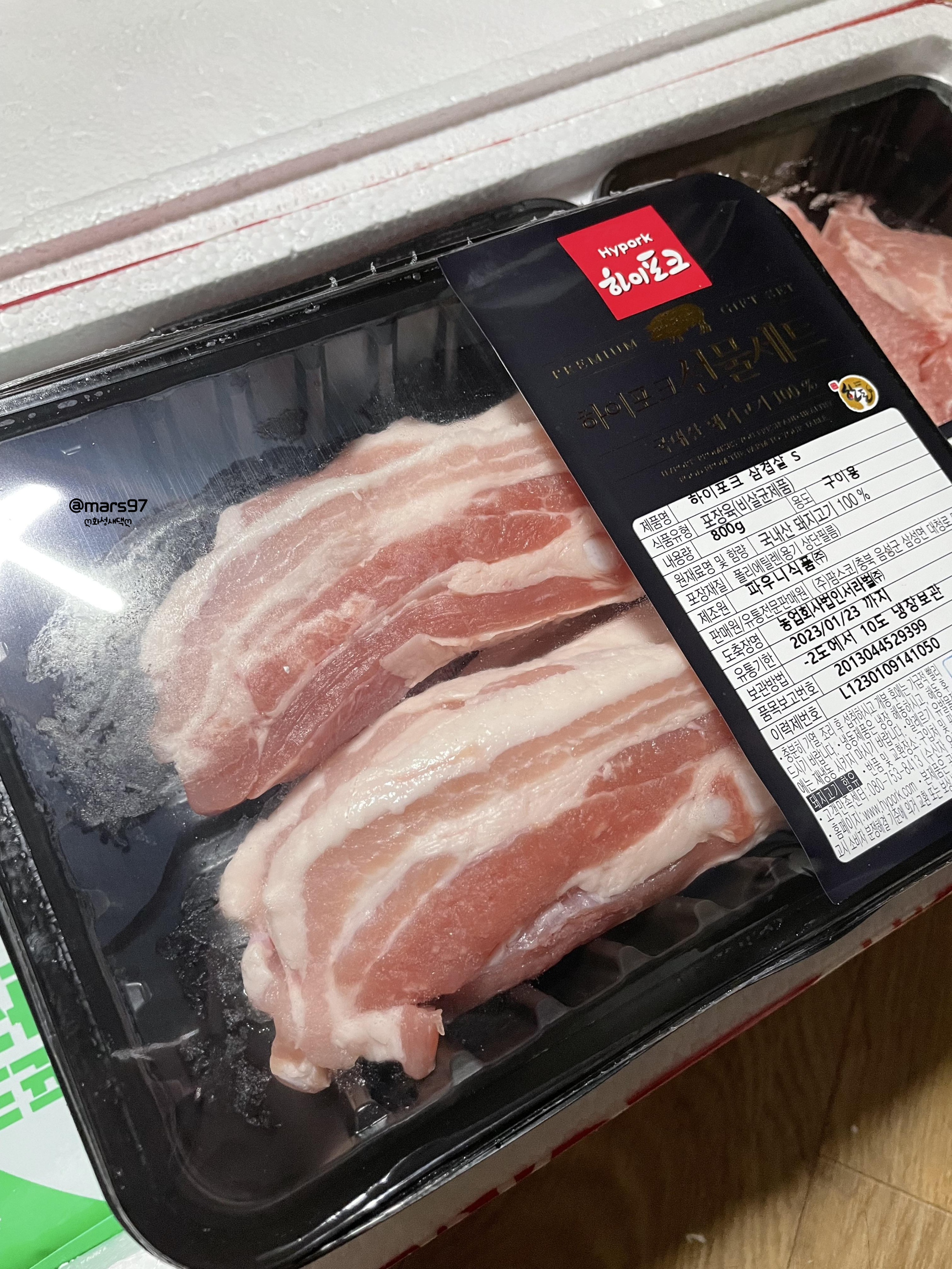 삼겸살, 목살, 앞다리살 모두 800g씩 들어 있어요