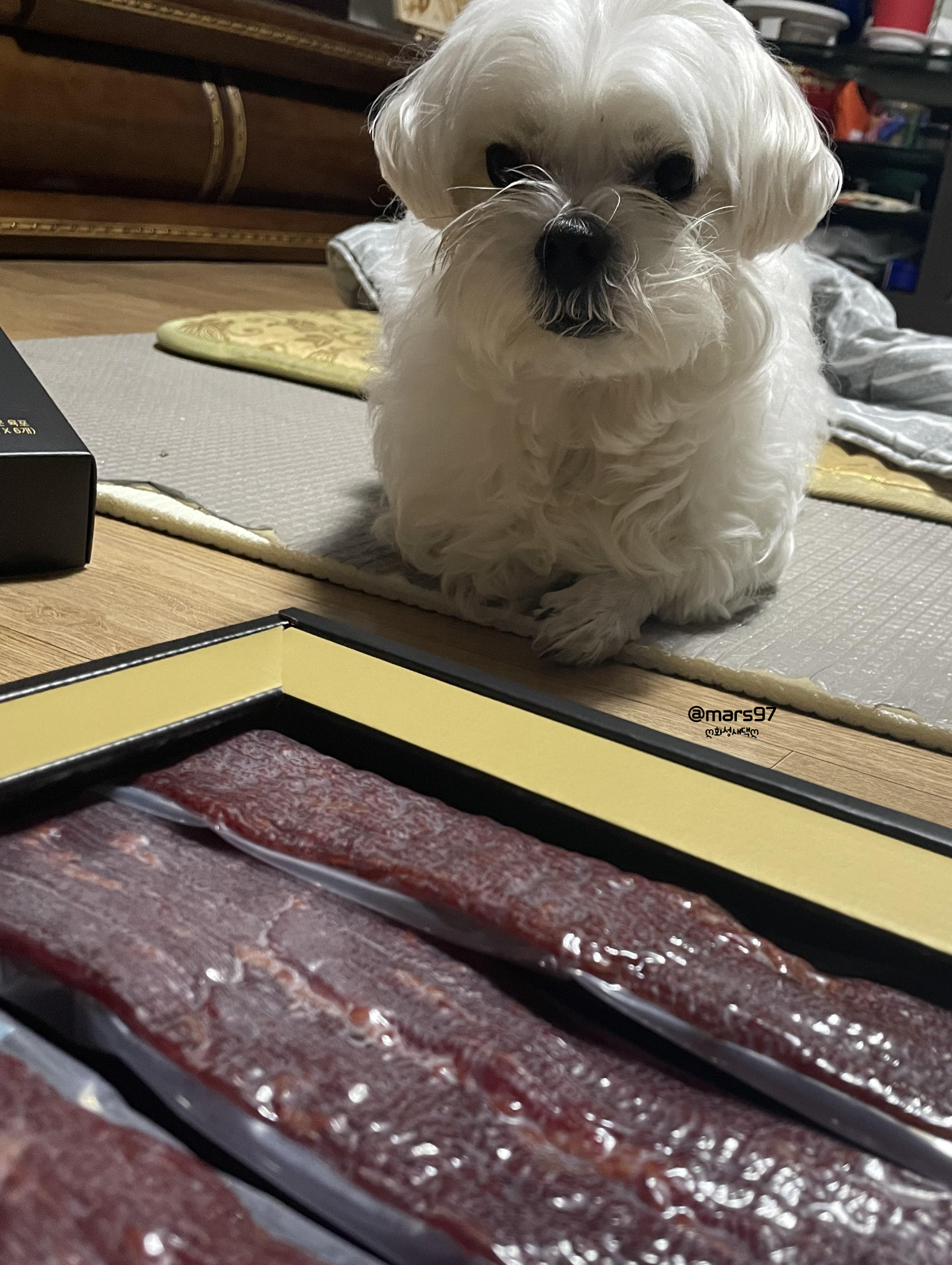 겨울이가 냄새 때문인지 육포 앞에서 떠나지 못하고 있더라고요 ㅋㅋㅋ
