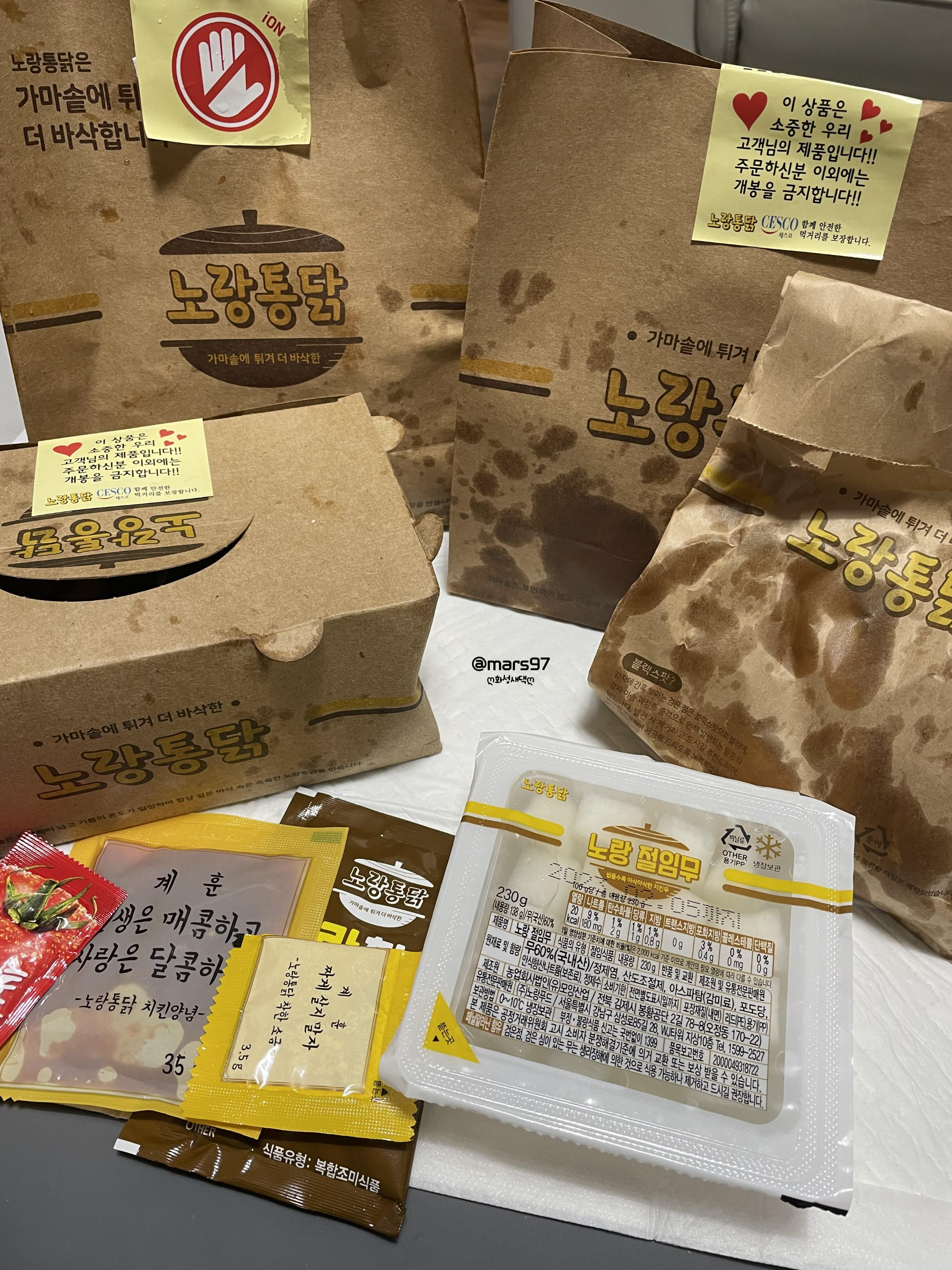 치킨과 감자튀김이 담겨 있는 봉투에도 개봉금지 스티커가 붙어 있어요