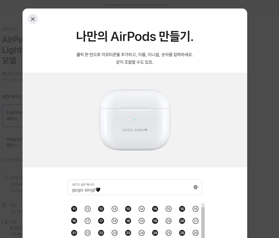 애플 공홈에서 에어팟 구매 시 에어팟에 각인이 무료예요!