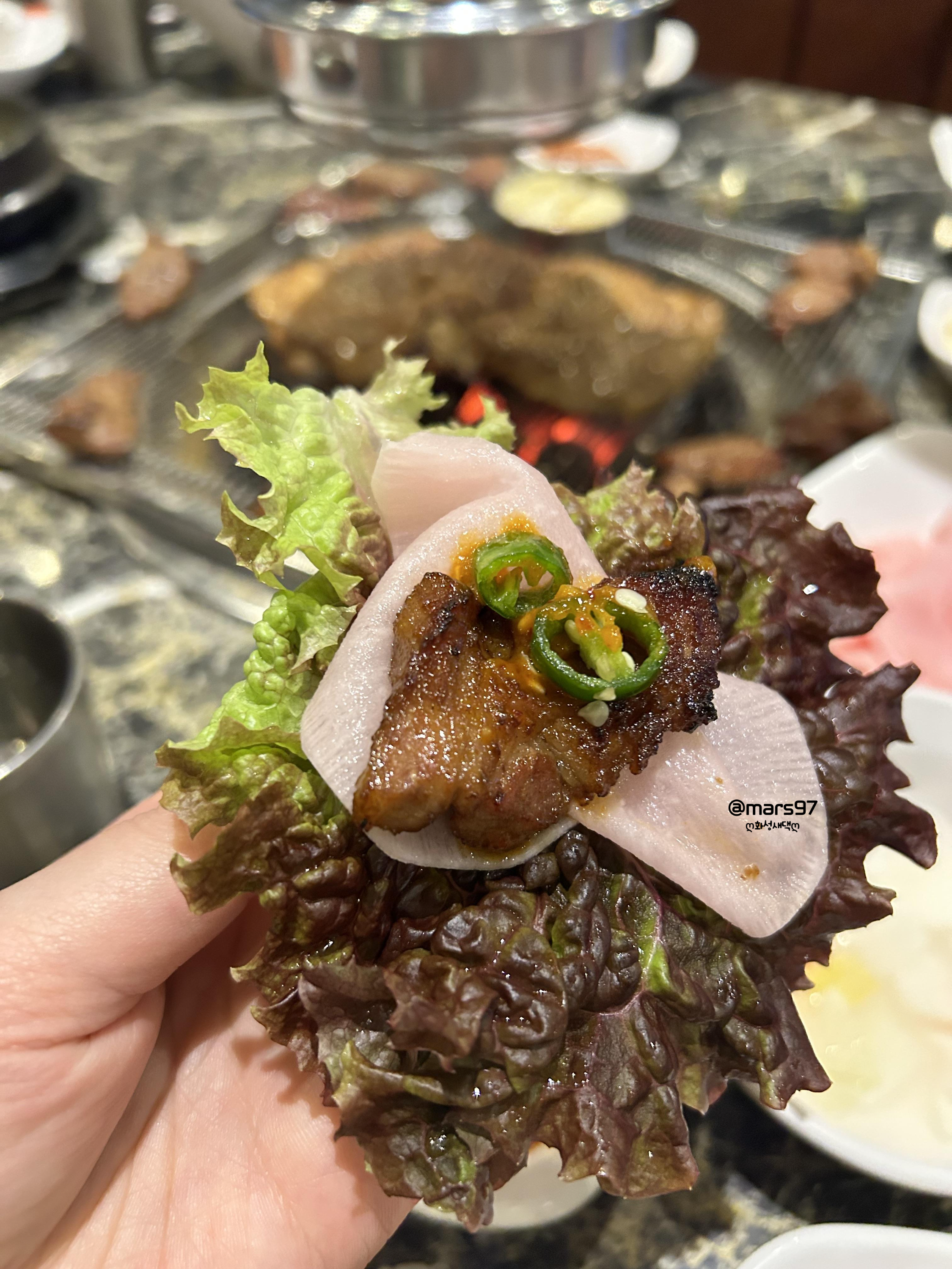 상추에 쌈무 올리고 고기 얹어서 고추 넣고 쌈 싸 먹었어요