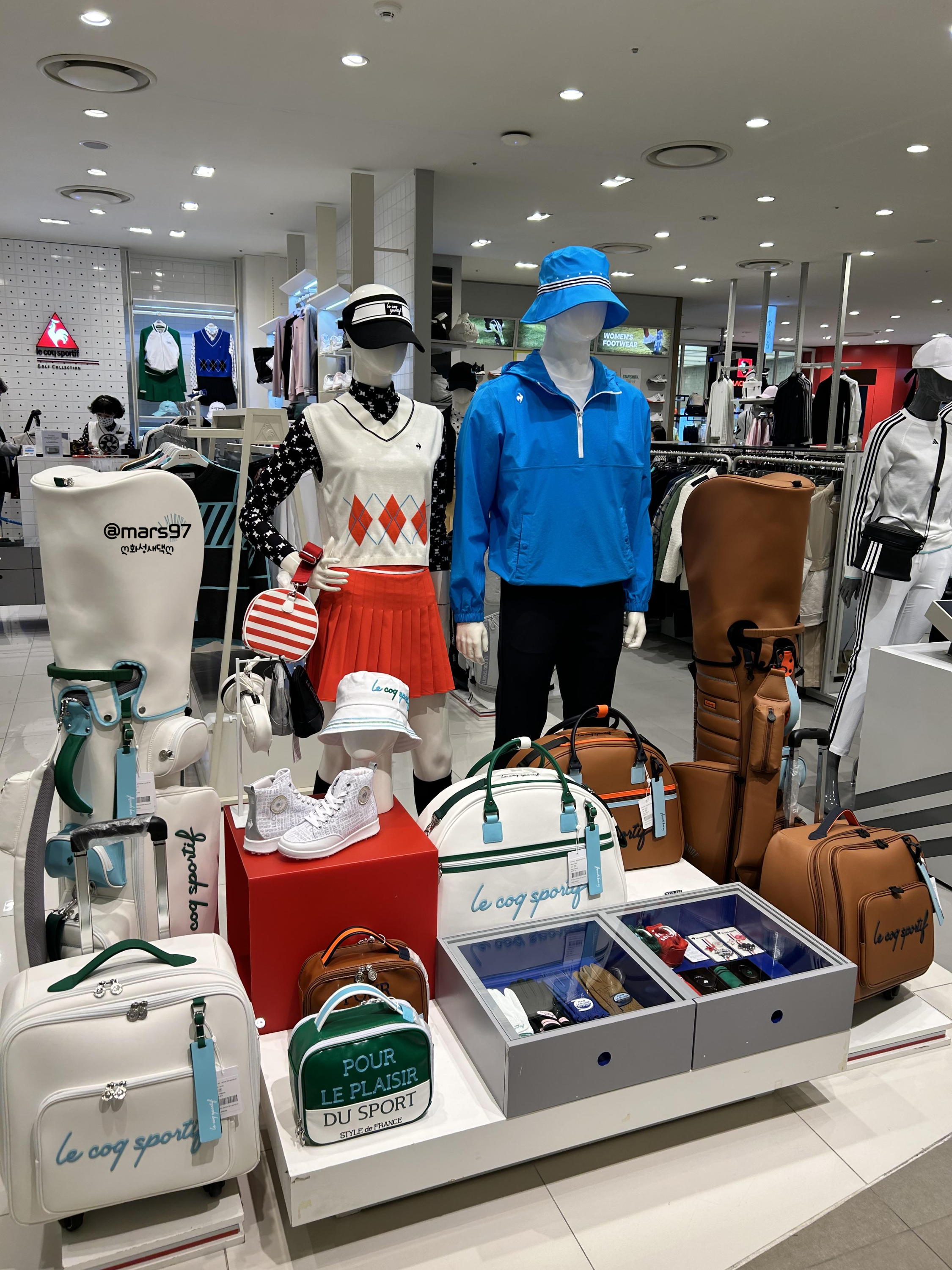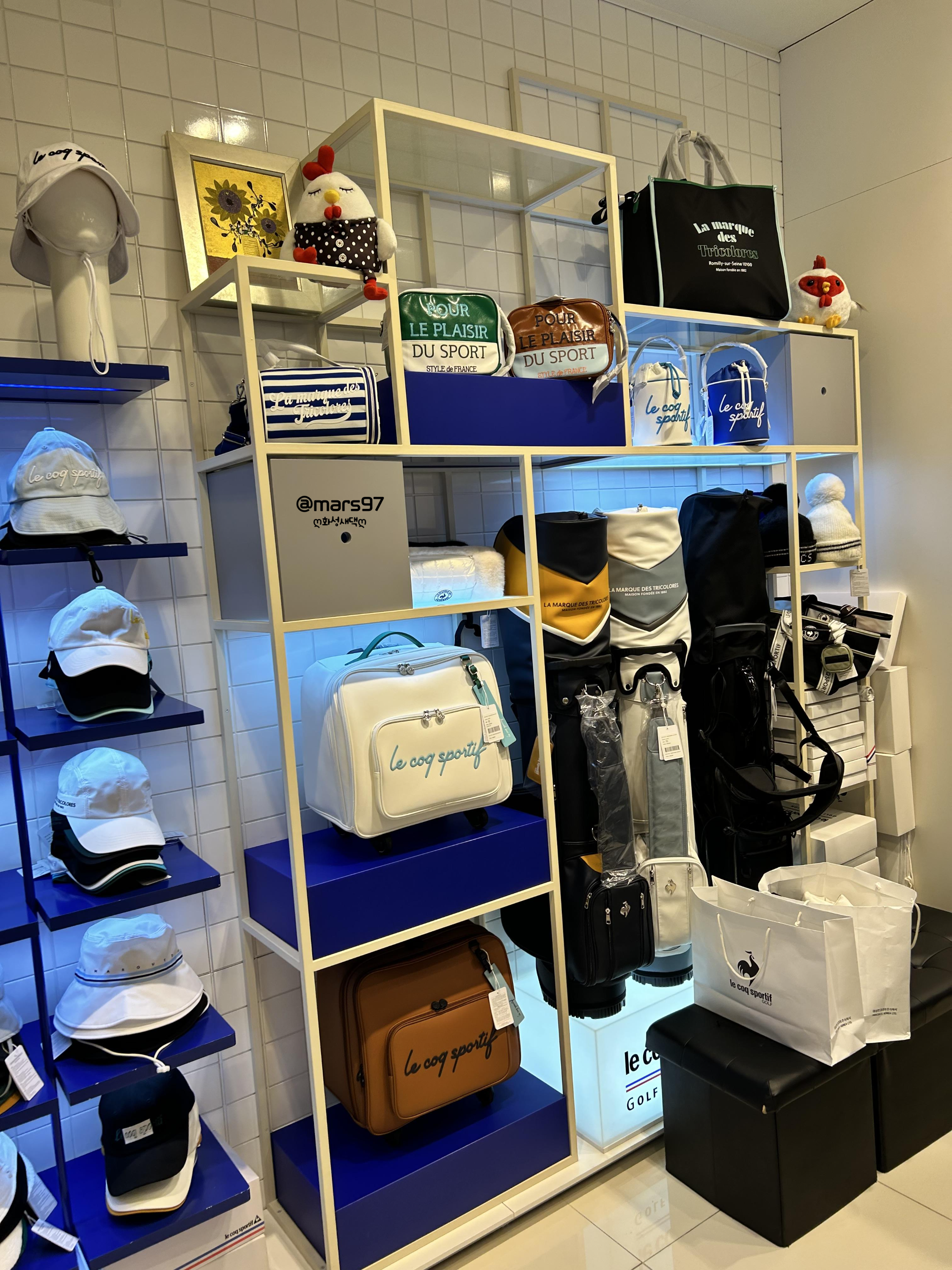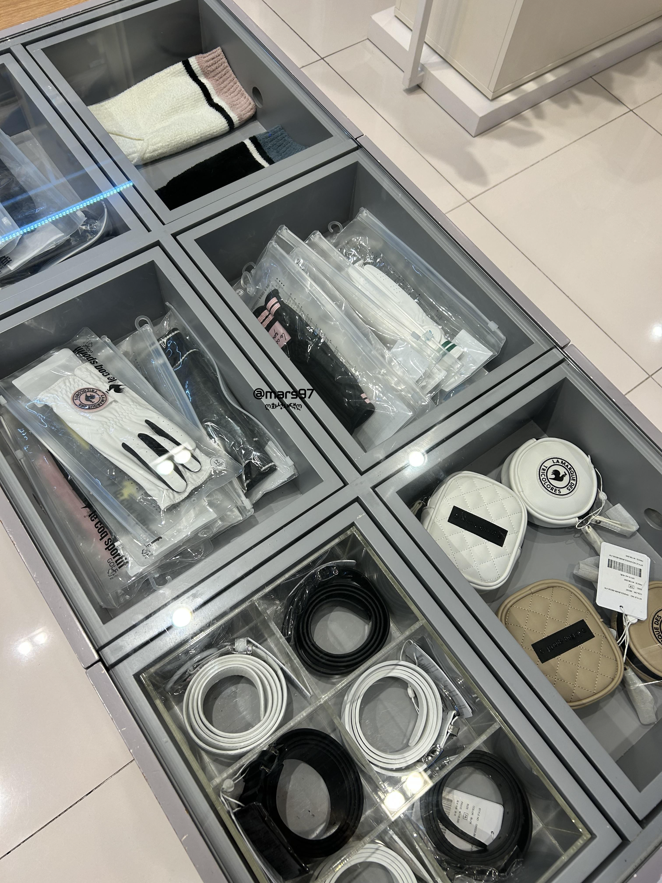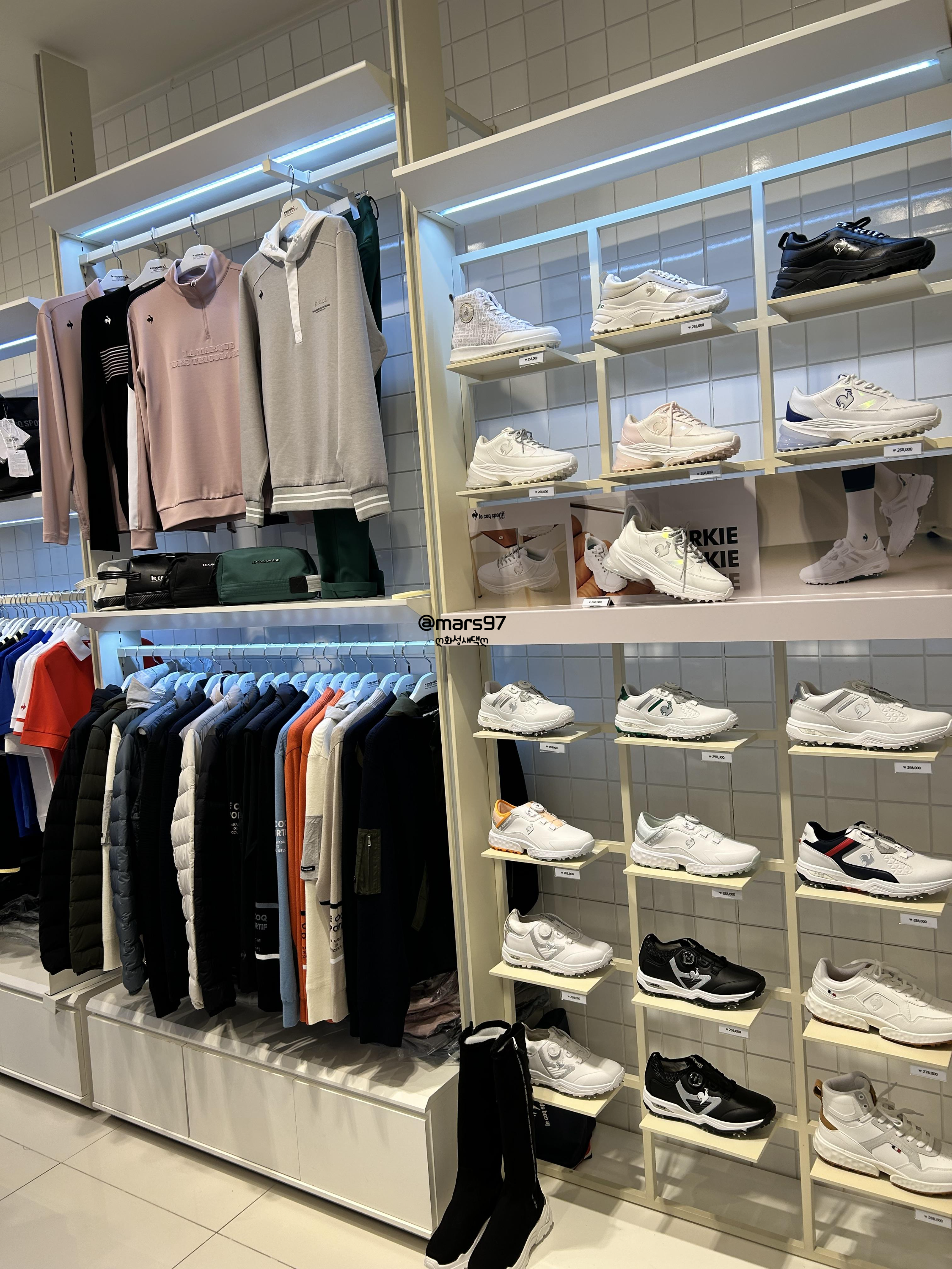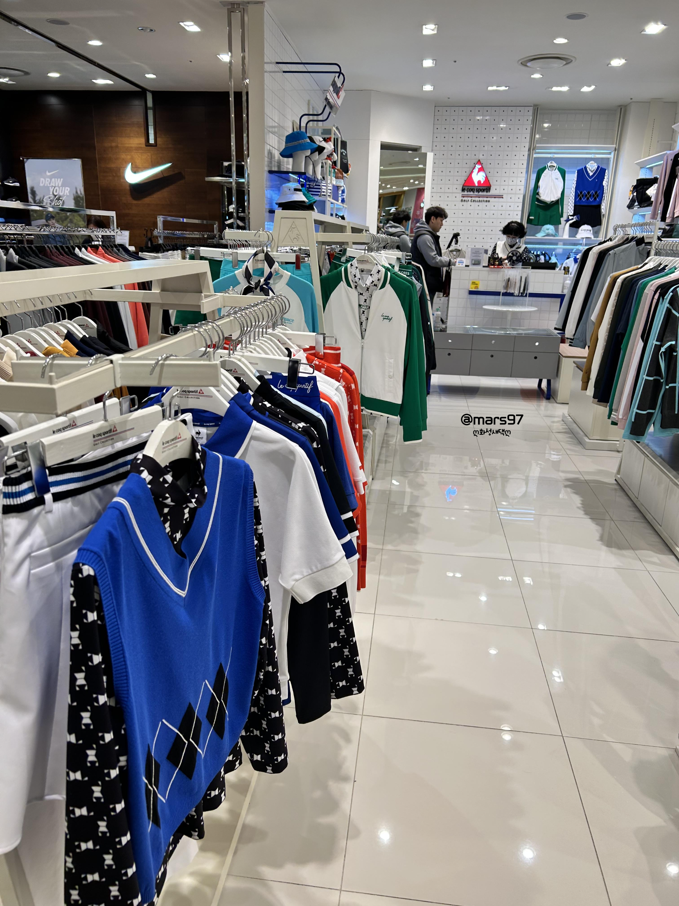 앞쪽에 골프 웨어랑 골프가방 등 전시해 놓은 게 너무 예쁘더라고요~