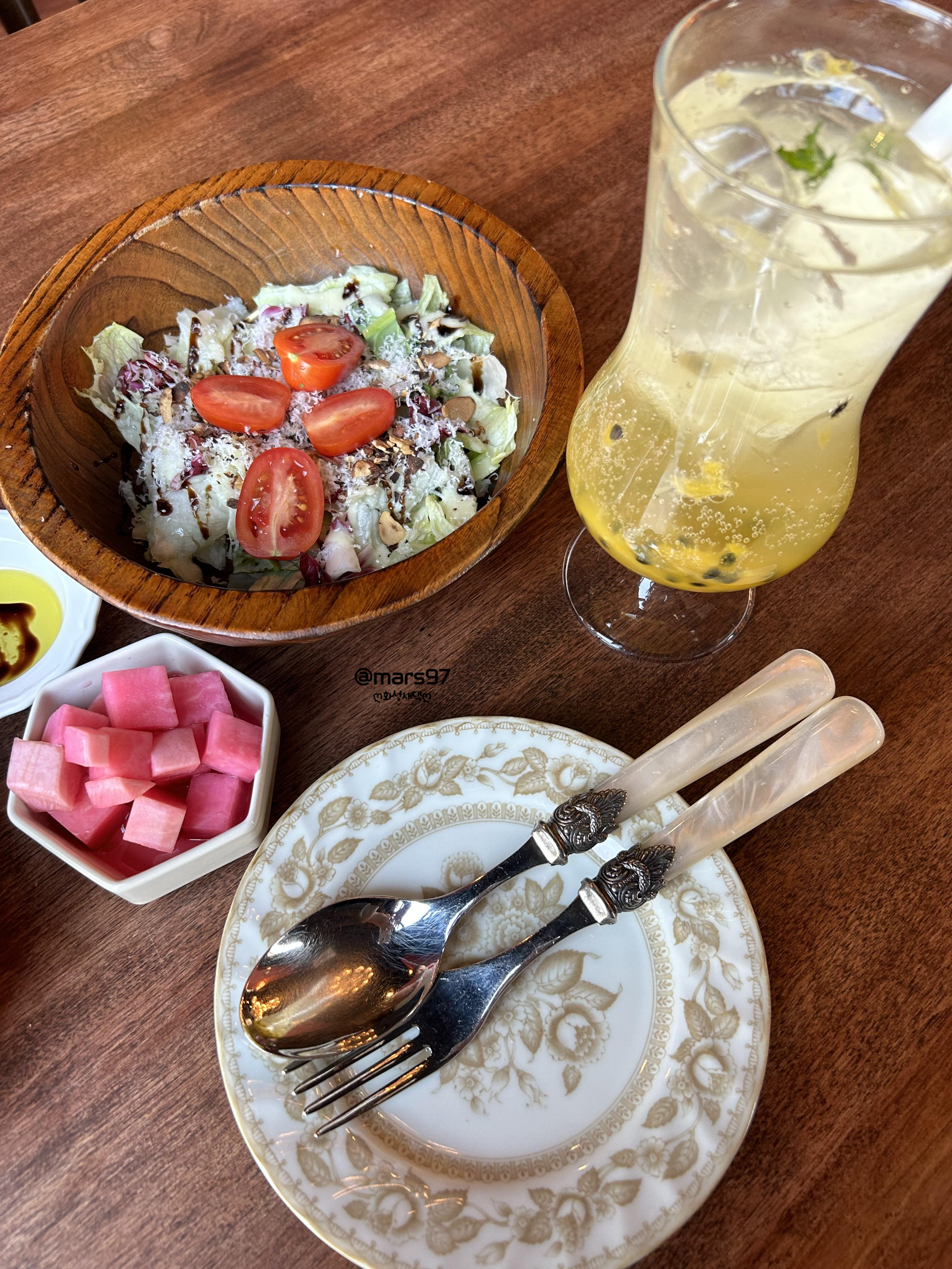 샐러드와 함께 패션후르츠 에이드가 먼저 나왔어요