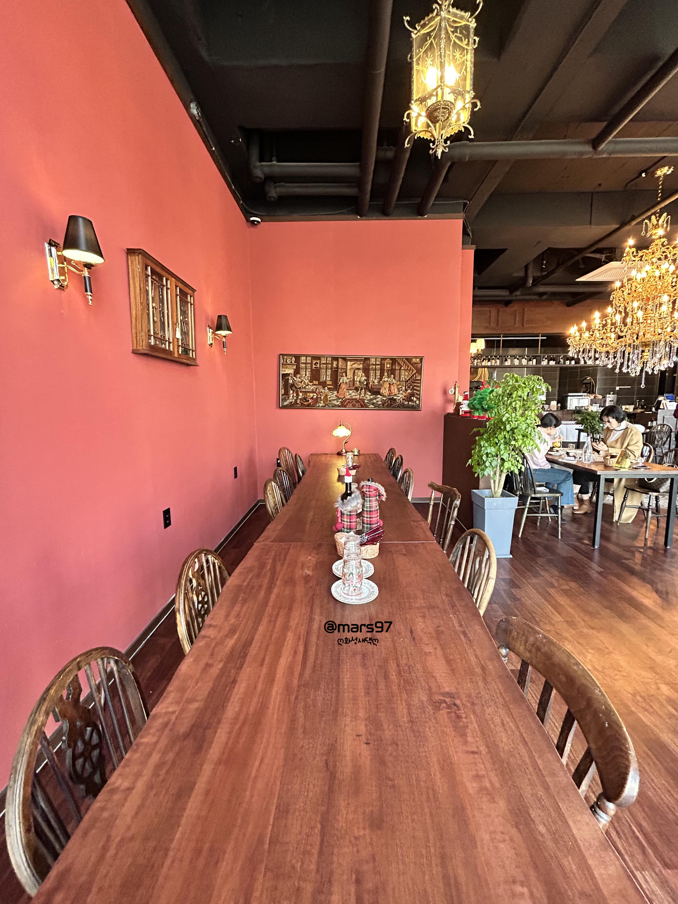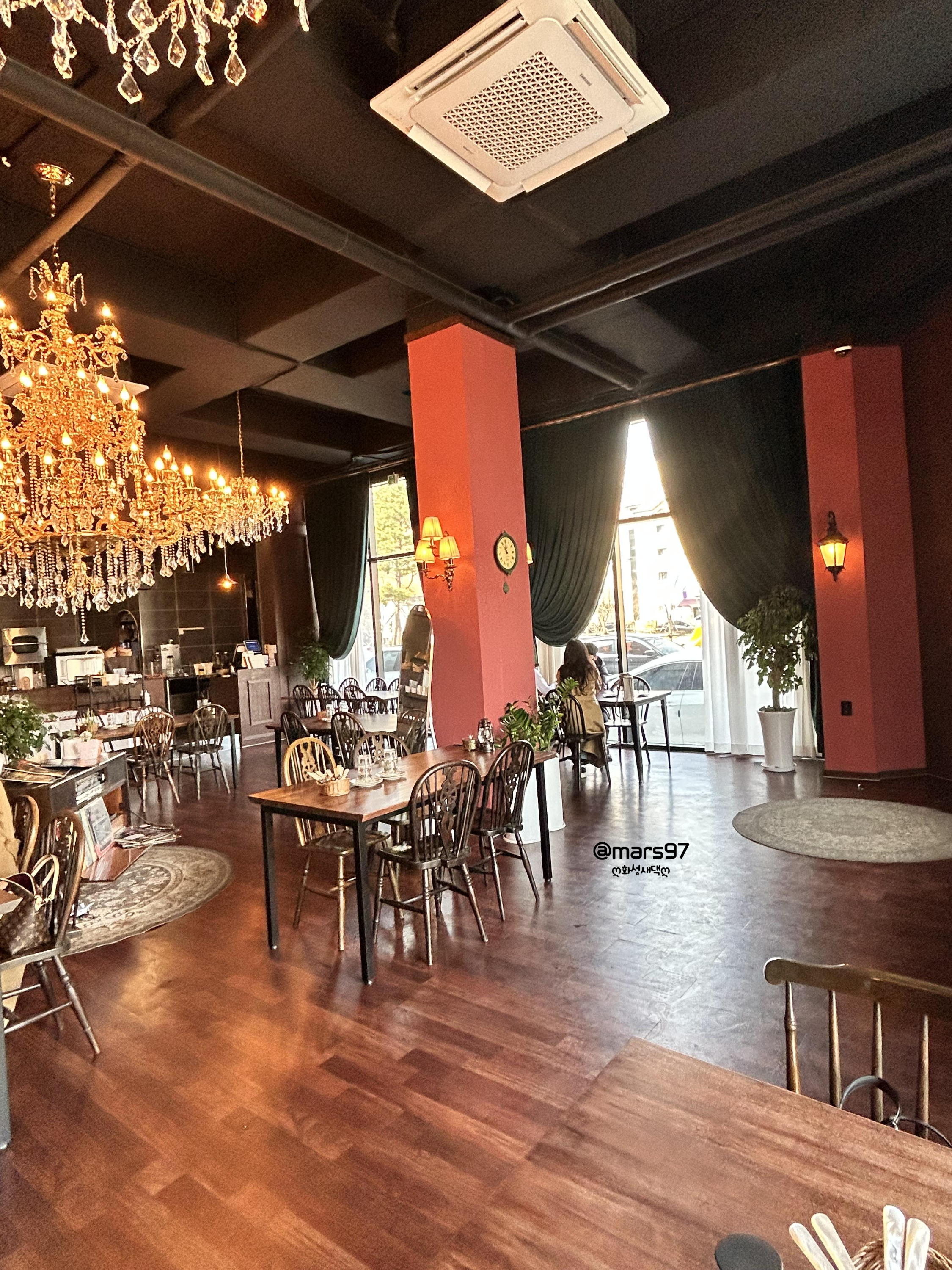 레스토랑 가운데에 있는 샹들리에가~