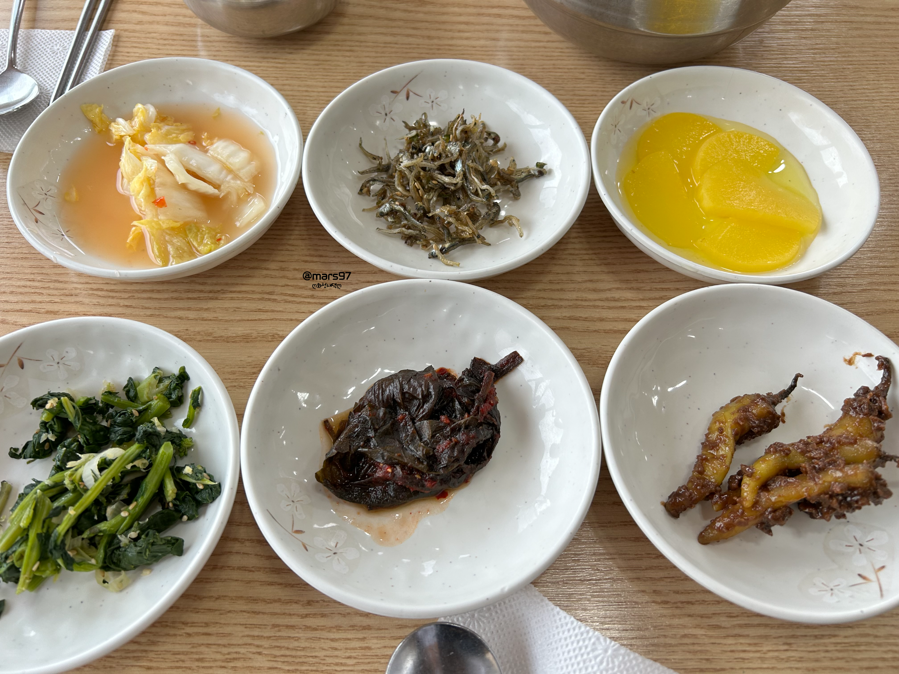 백김치와 멸치볶음, 단무지, 고추 장아찌, 깻잎, 나물까지~