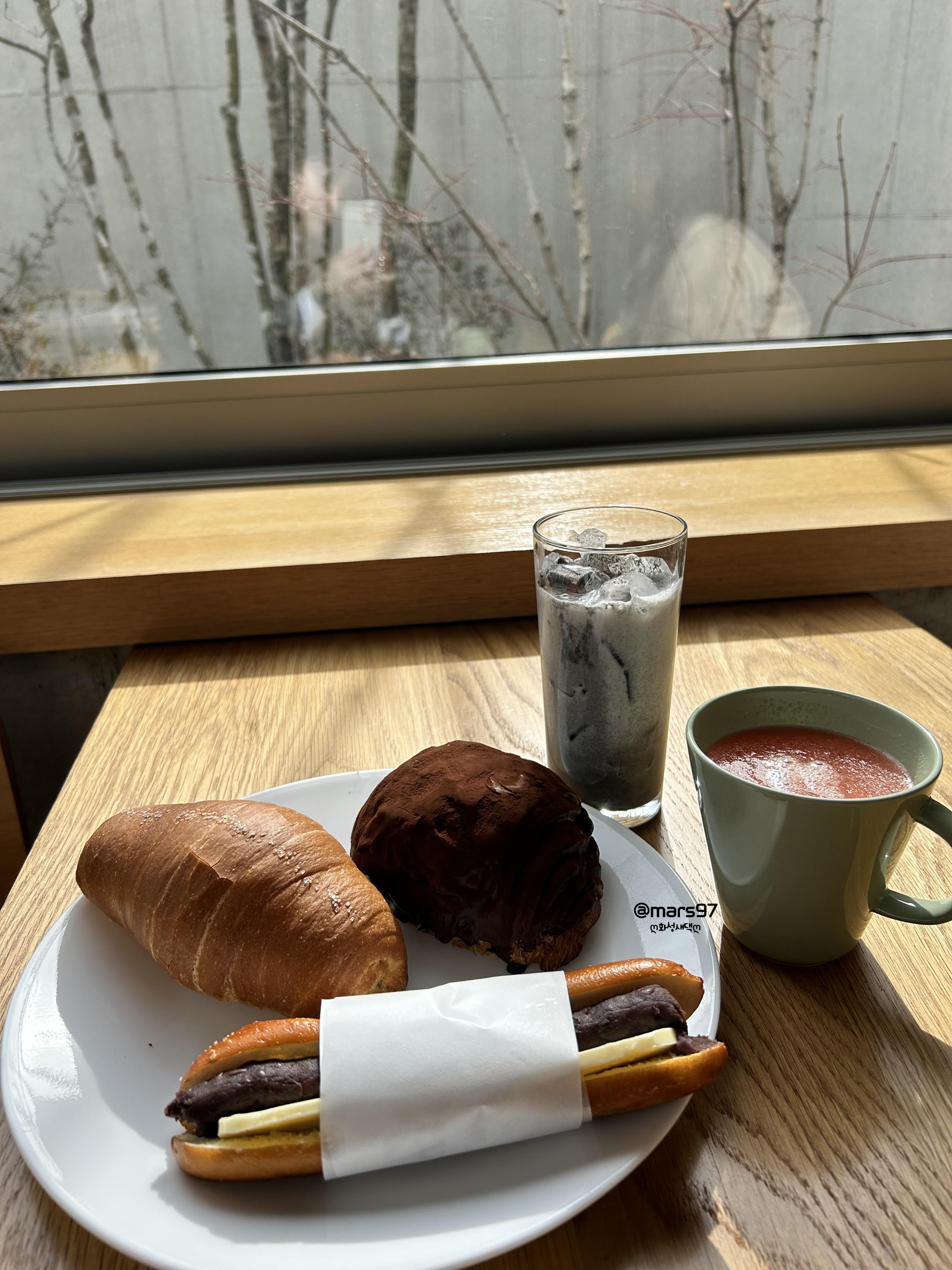 빵은 소금빵과 앙버터 프레즐, 그리도 블루베리 쇼콜라로 골랐어요