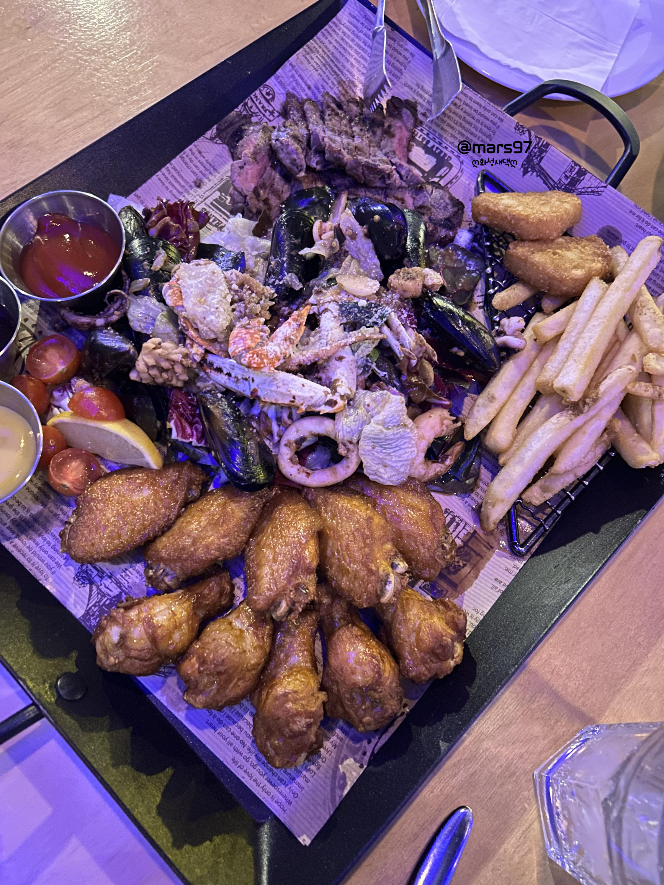 파스타와 스테이크, 윙, 감자튀김, 피자, 샐러드, 술안주로 라면까지