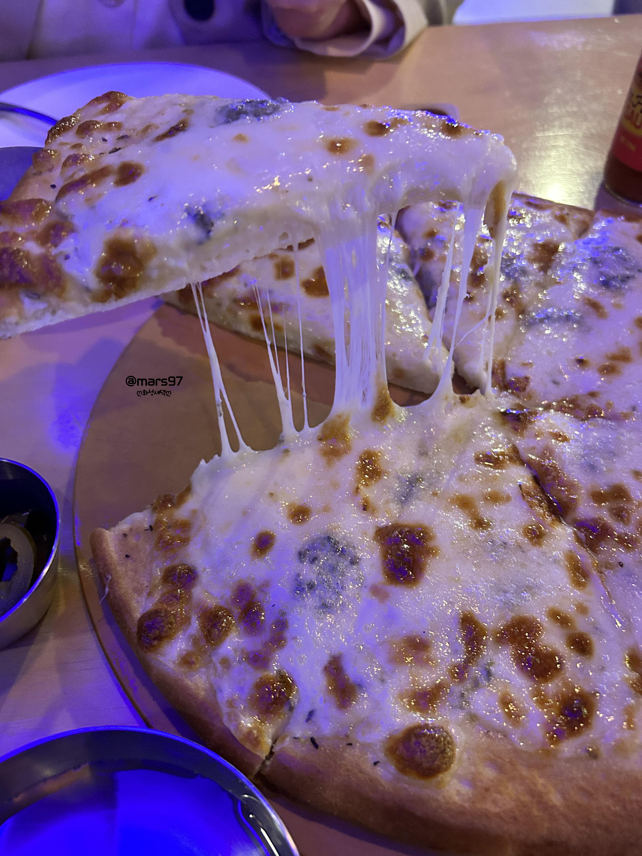 고르곤 졸라 피자에서 치즈가 이렇게 많이 늘어나는 건 처음 보는 것 같아요~
